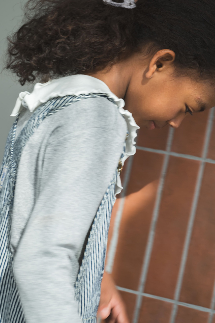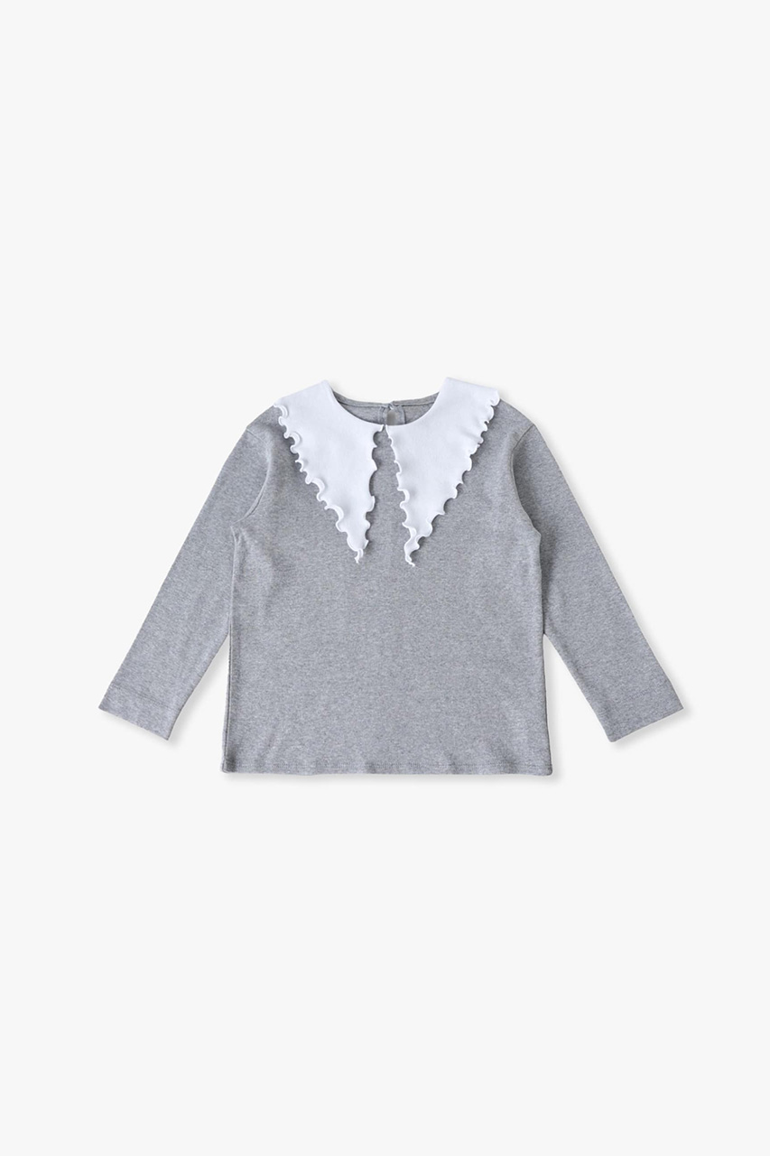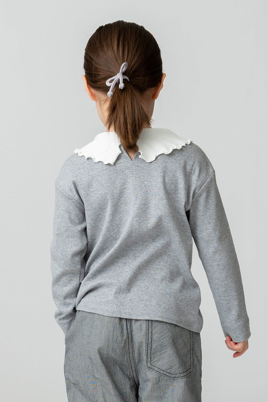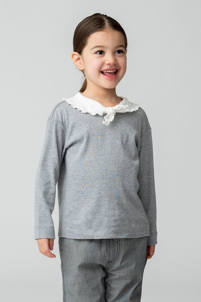 ブランドの定番人気アイテム、リボントップスをグレーでスペシャルオーダー。ソフト仕上げをしたコットンジャージー素材を使用し、伸縮性が高く着心地も抜群です。可愛らしいフリルの大きな襟は、襟先を結ぶと小さなリボンにアレンジができ、さまざまな表情をお楽しみいただけます。オーバーオールにインするのもおすすめ。お子様の成長とともに長めの袖丈から七分丈へと変化していき、何年も大切に着まわせます。