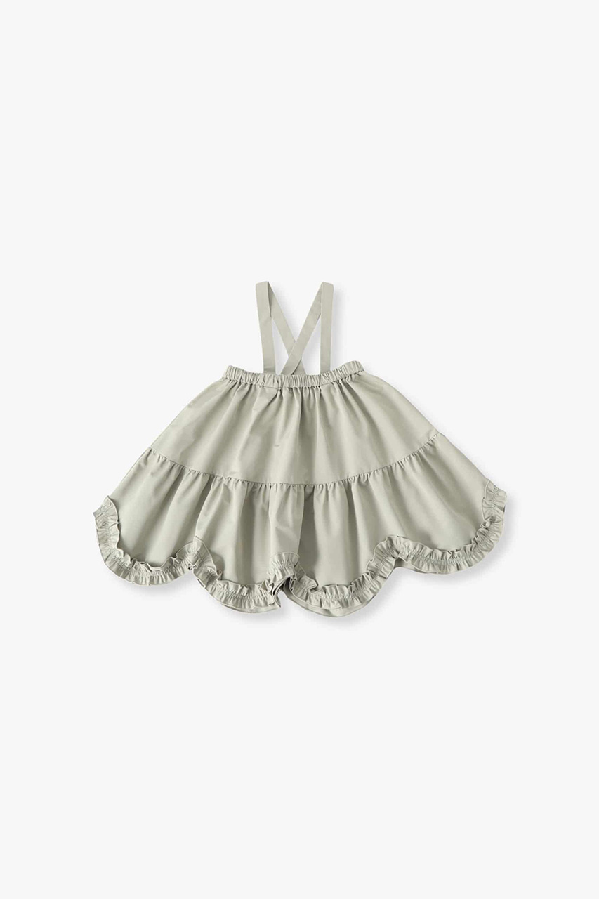 【AMICA】定番のクリノリンスカートをベースに、スペシャルオーダーしたスカラップドドレス。撥水タフタ素材に変更し、さらりとした肌触りと優れた速乾性を備えているので元気いっぱいなキッズにも安心。裾にスカラップデザインを取り入れ、とびきりキュートな印象に。ストラップドワンピース・サスペンダースカート・シンプルなスカート・トップスとして使える4wayデザインです。ベビーの時はワンピースとして、少し大きくなったらスカートとして楽しめる仕様で、お子さまの成長に寄り添いながら長く活躍します。