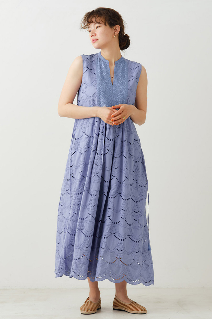 ドット模様を繊細なヘムラ刺しゅうで描き出した、程よい存在感のノースリーブドレス。広がりすぎないロングシルエットは、付属のウエストベルトで軽く結べば、自然なメリハリと女性らしいラインを演出。歩くたびに裾からのぞくほのかな透け感が、気品とともにシーズンムードをふわりと漂わせる一着。