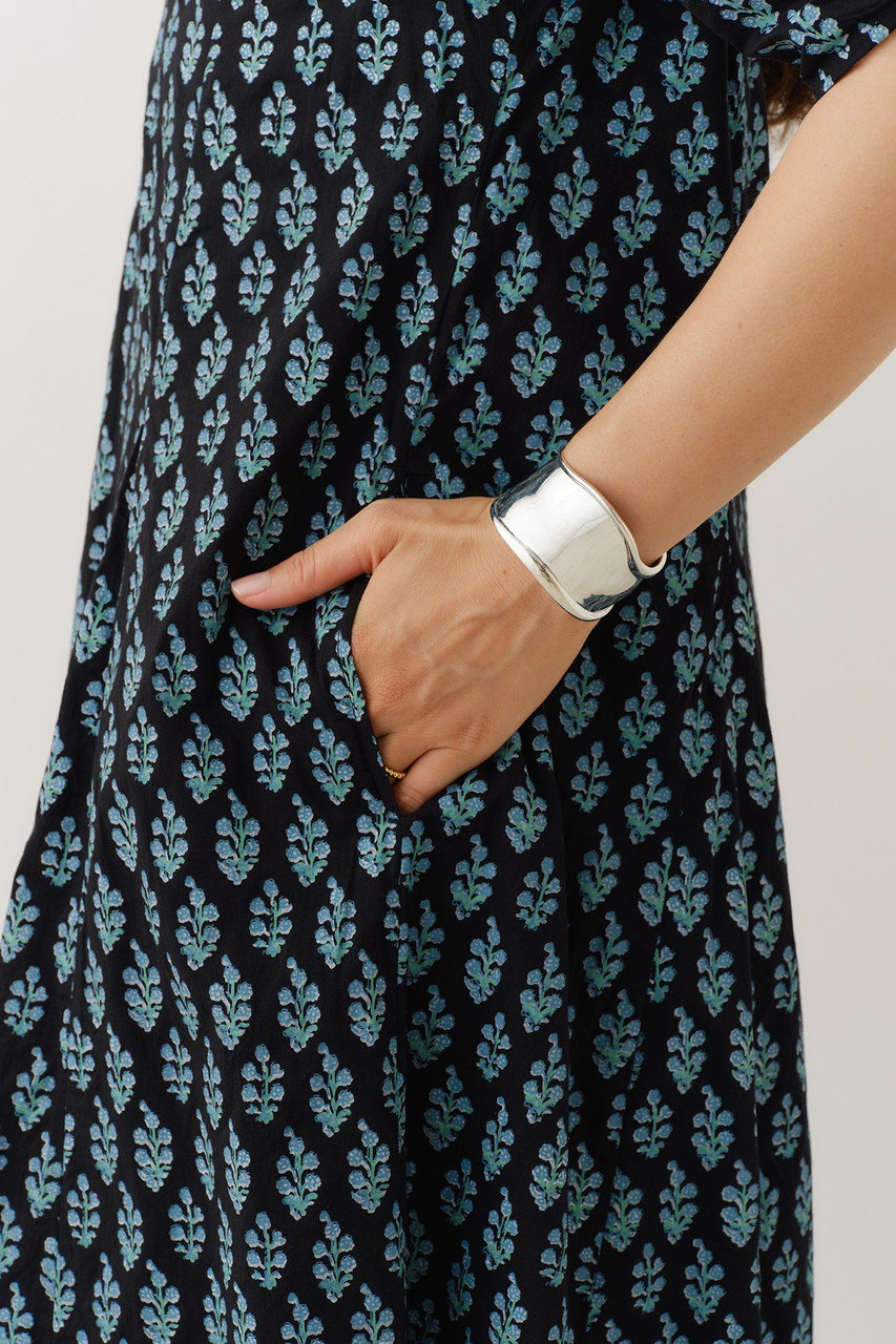 インドの先住民族が手がける“ゴンドアート”に着想を得た、鮮やかな色柄が視線を奪う一着。軽やかなコットンボイルに、前後Vあきのネックラインや背中のリボンコード、揺れるチャームがさりげない甘さをプラス。袖にはタックとギャザーを寄せ、ふんわりと広がる5分丈に仕立てました。高めのウエスト位置から裾へと流れるパネル切り替えが、歩くたびに美しいフレアを描きます。一枚でリラックス感と華やかさを叶えるドレス。