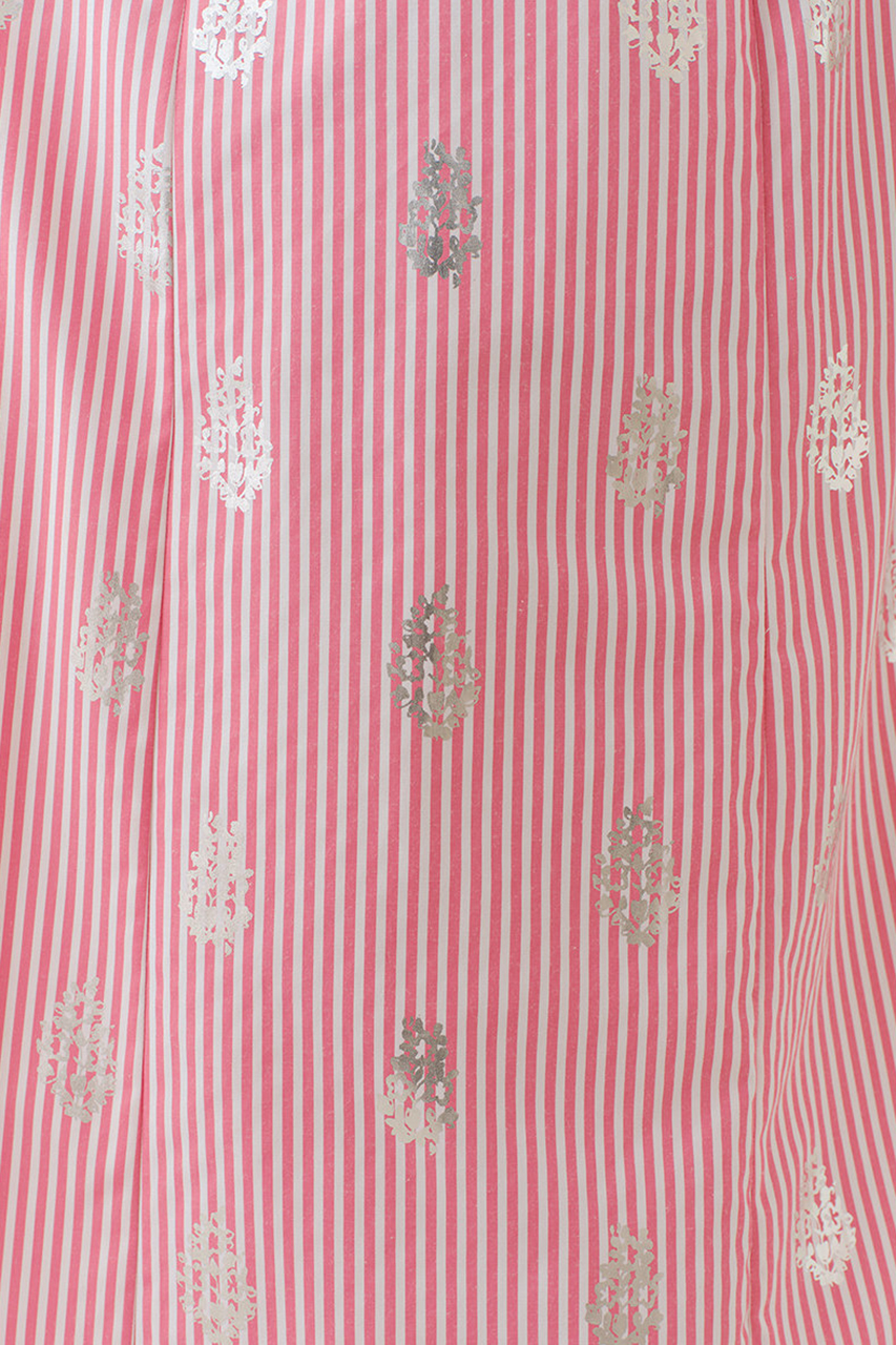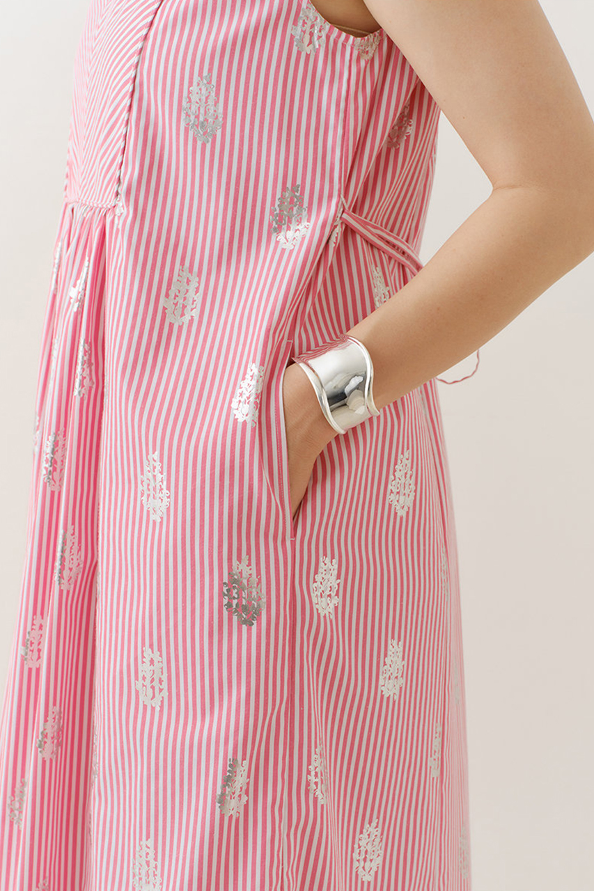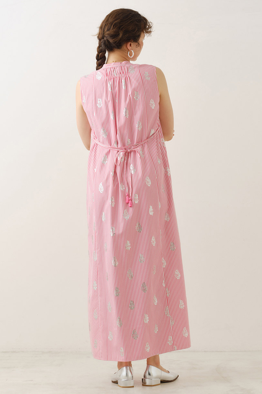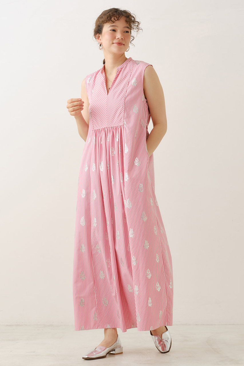 COTTON POPLIN STRIPE ホイル プリント ノースリーブ ドレス