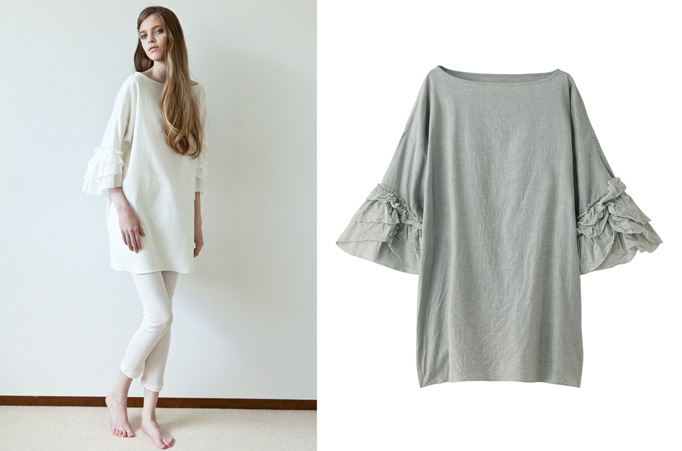 軽やかでロマンティックなオーガニックコットン素材のワンピース。風合いの違うコットンのフリルを、幾重にも重ねたスリーブでドレッシーな印象に。ふわっとしたシルエットながら、ボートネックが顔まわりをスッキリと演出しています。