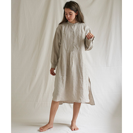 織見出し:加工を日本の滋賀県で施したリネン100%生地をぜいたくに使ったワンピースです。風が通り抜けるようなオーバーシルエットで、いつものパンツやマキシスカートにふわりと重ねるのもおすすめ。肌なじみのよい、自然の色そのままのフラックスカラーで、纏っただけでこなれたリュクス感が香る1着です。