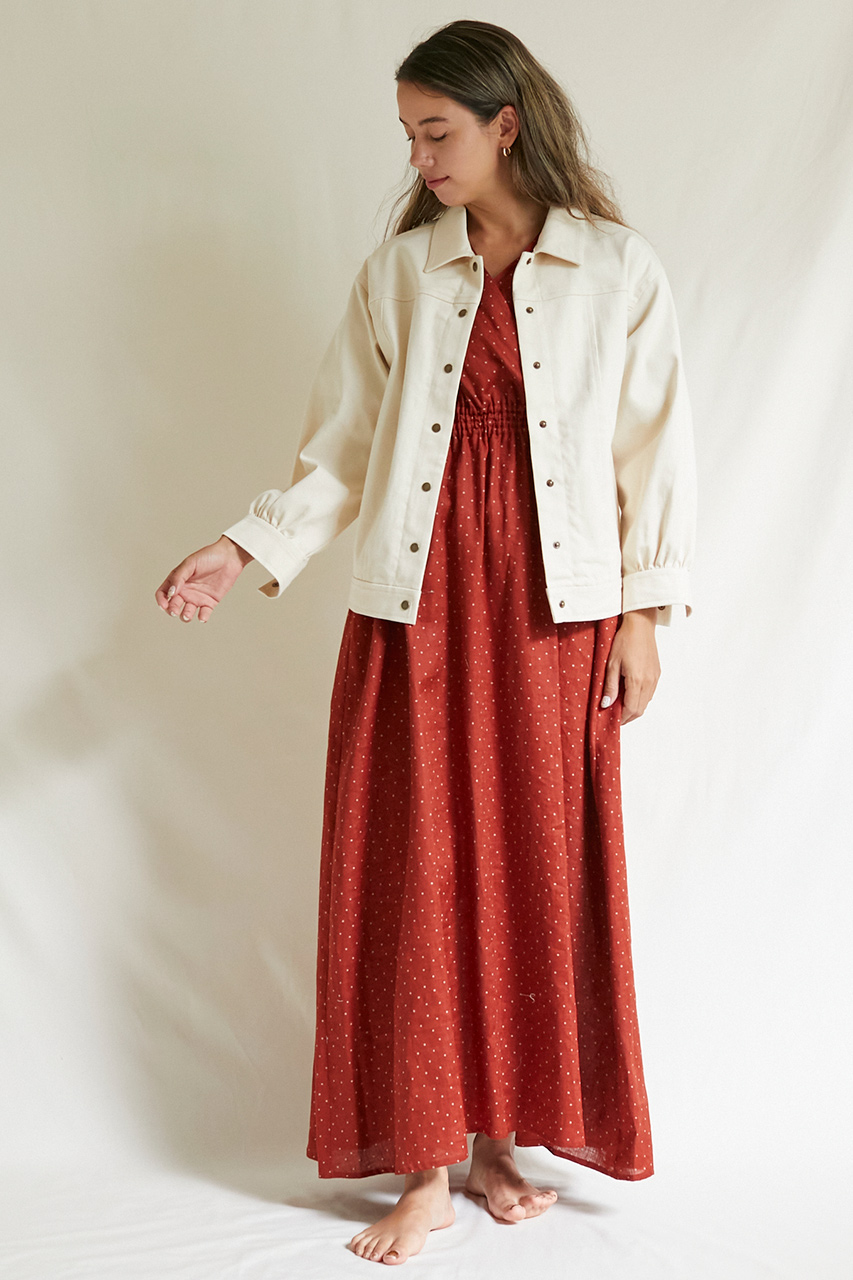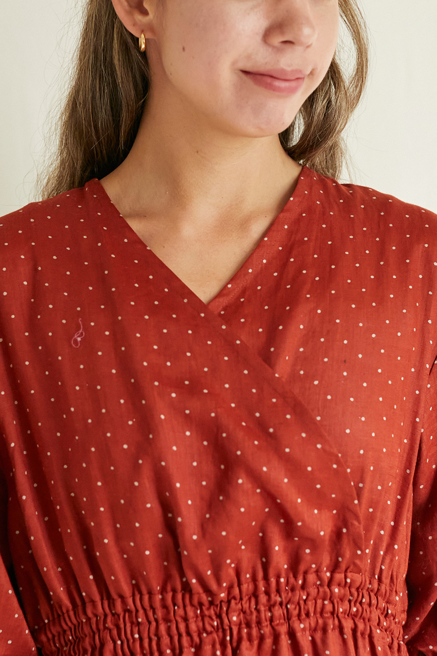 「ナナデェコール」らしいフェミニンなシルエットのカシュクールスタイルワンピ-スです。特有のシャリ感が涼しげなリネン100%生地に小さなドット柄を施し、クラシカルな雰囲気に。カラーは落ち着いたレッドと爽やかなホワイトの2色をご用意しています。