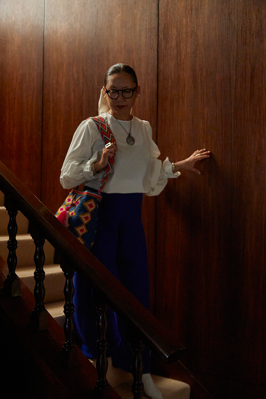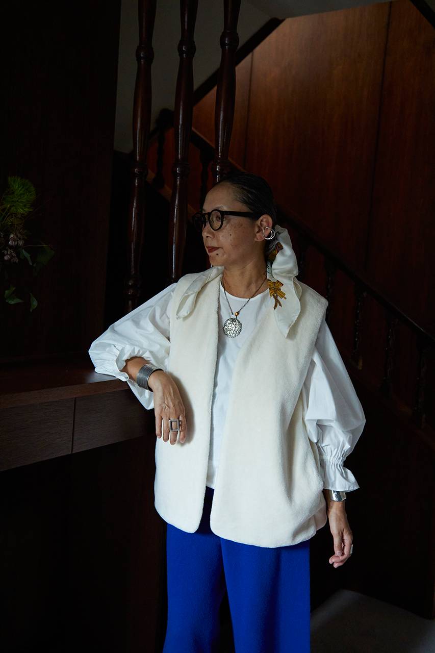 ボリューム袖は、デニムやワイドパンツ等とあわせるとドレッシーになりすぎずトレンド感のある雰囲気がつくれます。肌寒い季節はオーガニックコットンファーのベストを合わせるとウォーミーな雰囲気に。