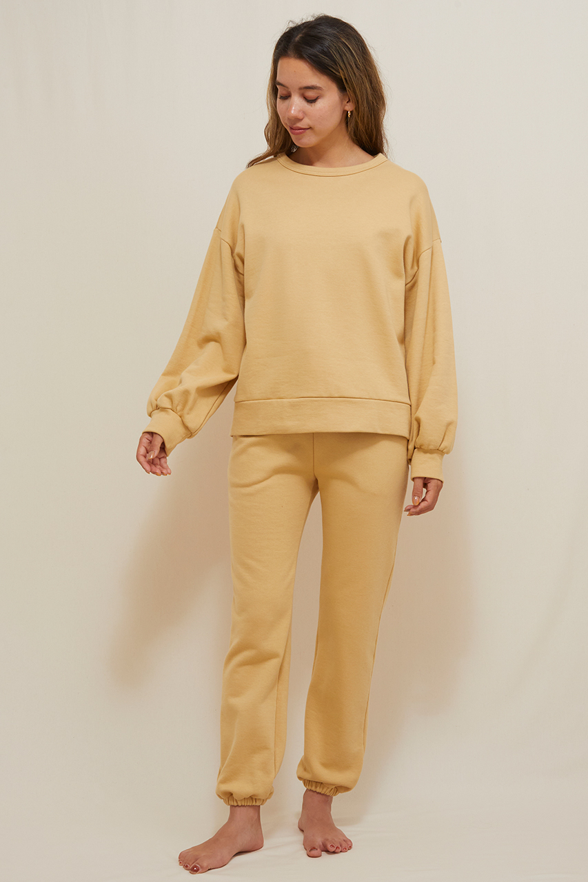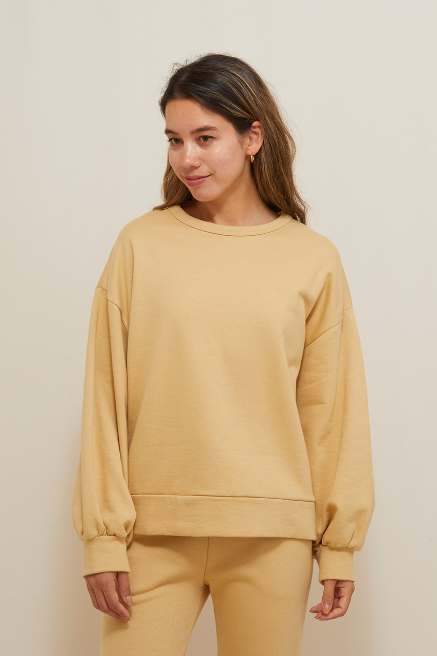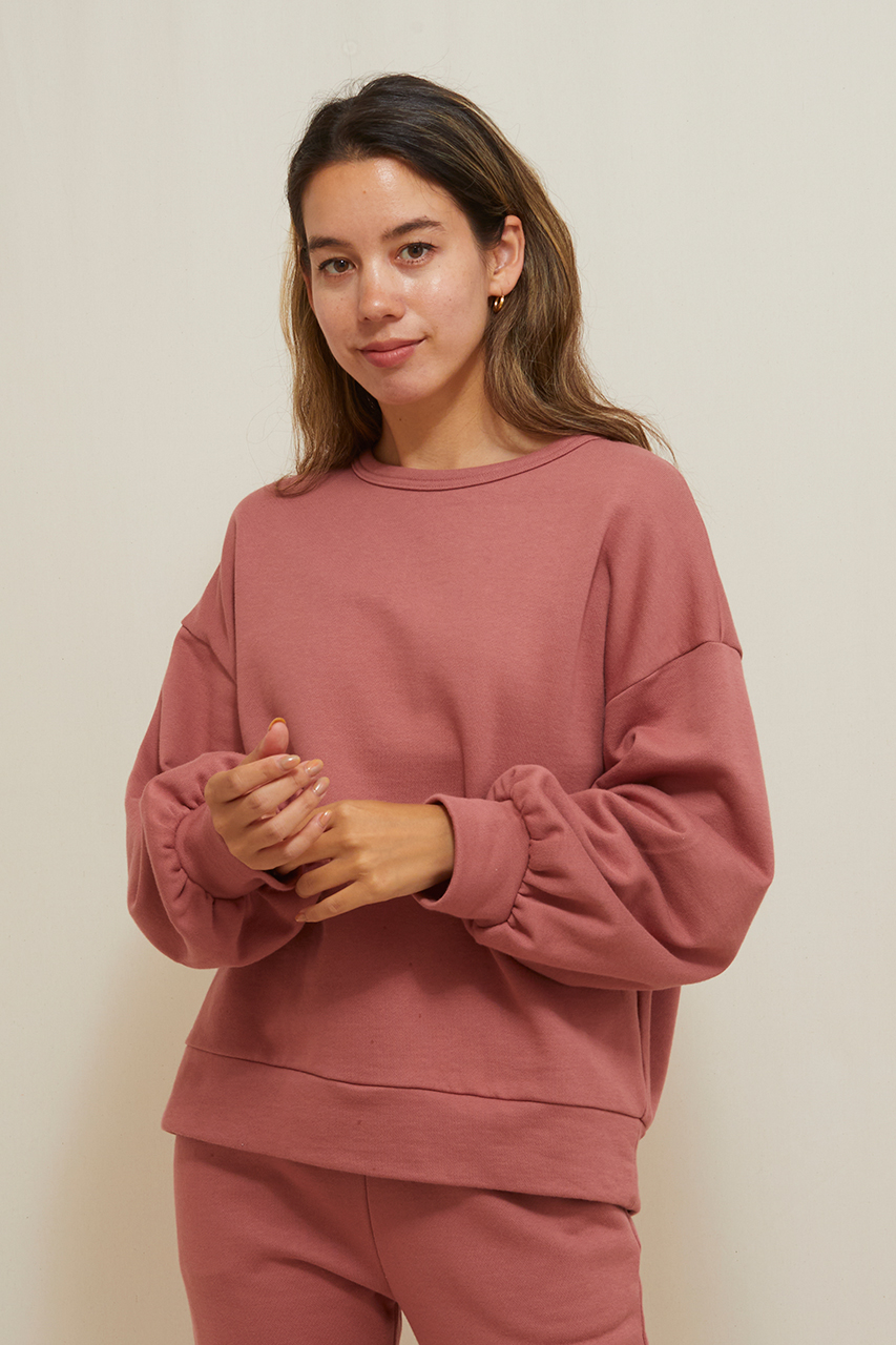 カジュアルアイテムのスウェットにも、ボリューム袖でフェミニンさを+。オーガニックコットン生地をたっぷり使用したゆったりシルエットなので、ボディラインをひろわずカバーしてくれます。襟や袖口はリブ仕様で、首元からインナーをのぞかせたり、袖を上げて手首を見せて華奢見せするなど、様々にコーディネートを楽しんでいただけます。同シリーズのパンツとのセットアップもおすすめです。