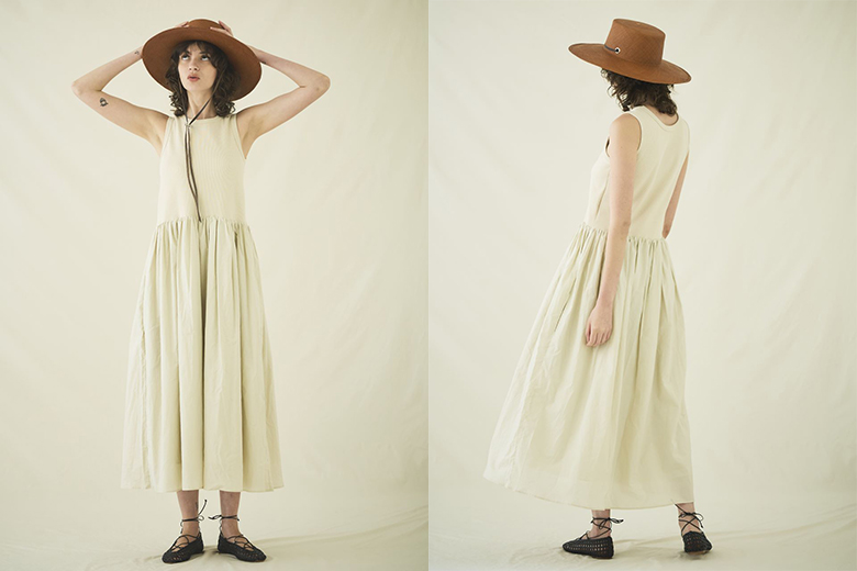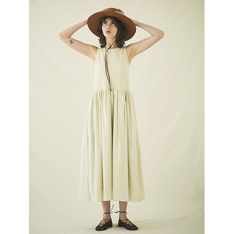 トップス部分は肌ざわりが良く、伸びも良いオーガニックコットンのリブ素材。取り外し可能なパット付きで、1枚着できるのも嬉しいポイントです。スカート部分は薄手のオーガニックコットンを2枚重ねにしているので、透けが気にならずペチコートなどを重ねなくてもOK。ウエストまわりのシルエットを美しく見せるデザインで、歩くたびにふわりと揺れるフレアシルエットのロングスカートが上品です。