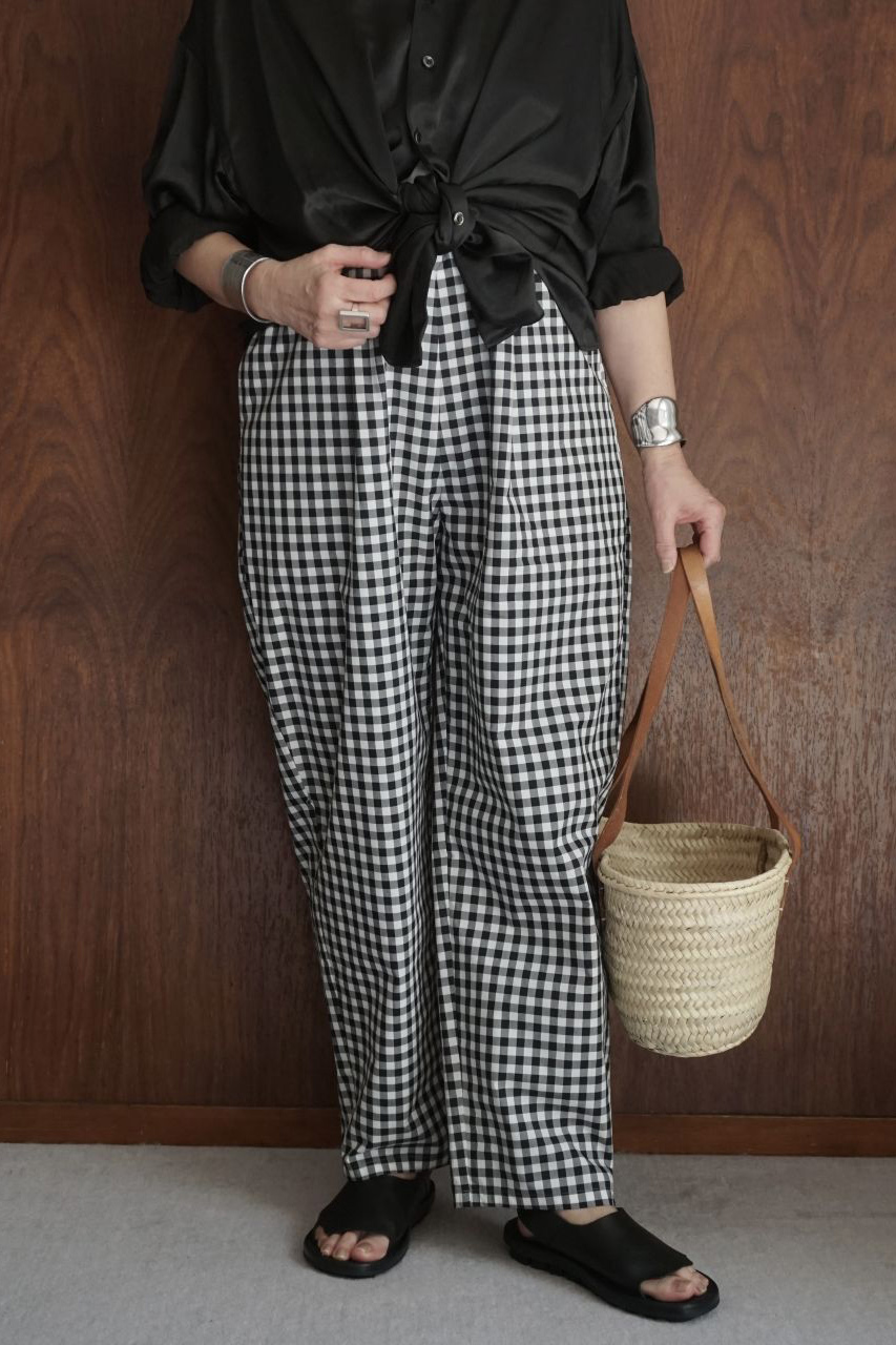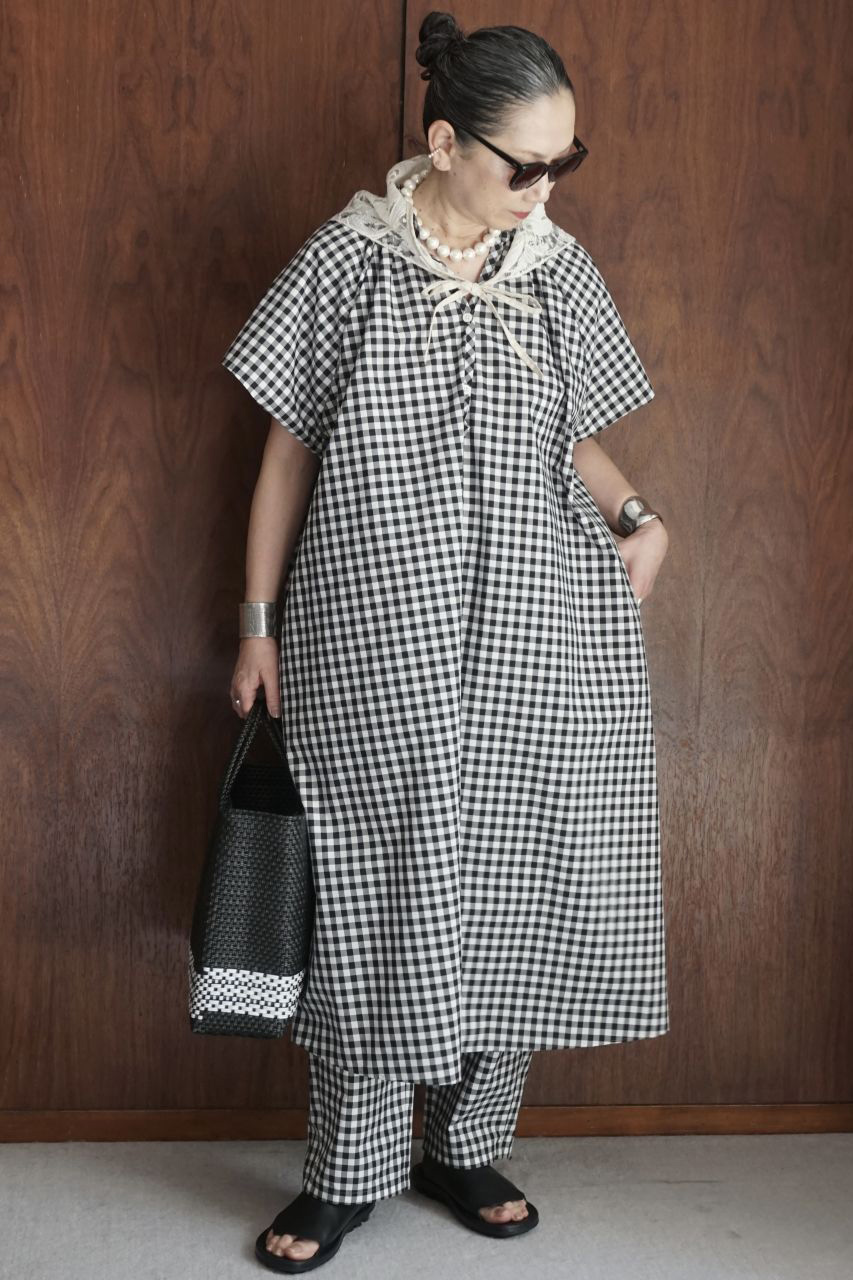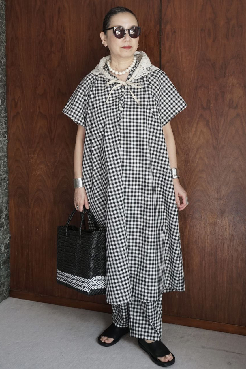 年齢を問わず愛されるギンガムチェックのワンピースとパンツです。黒と白のシンプルな配色は、装いをすっきりと見せてくれるだけでなく、