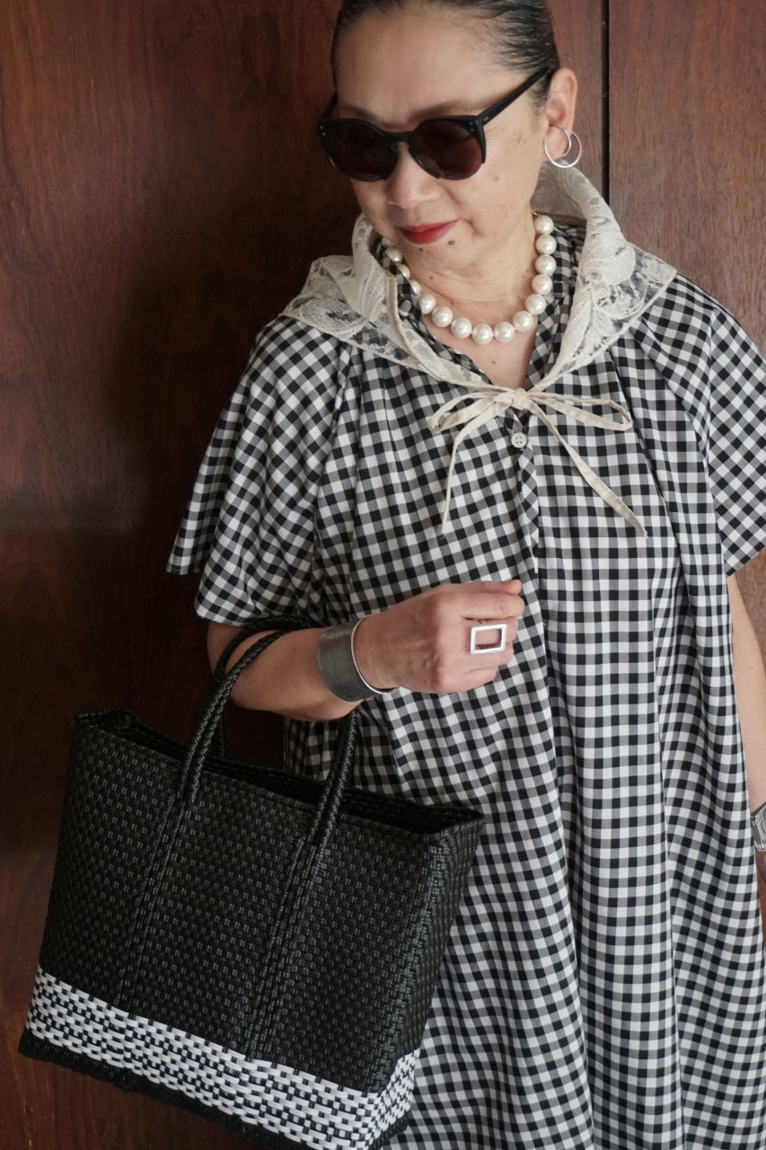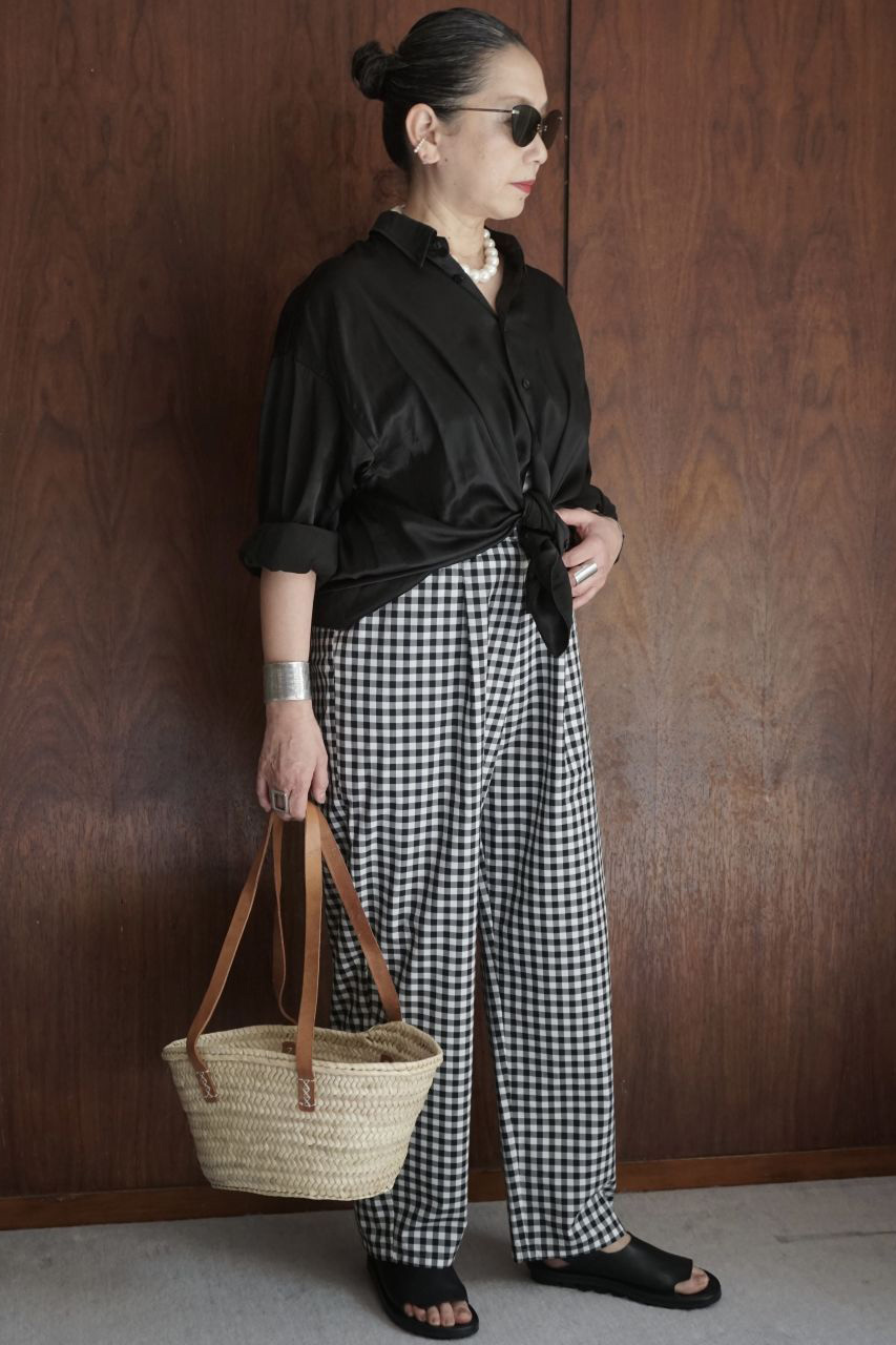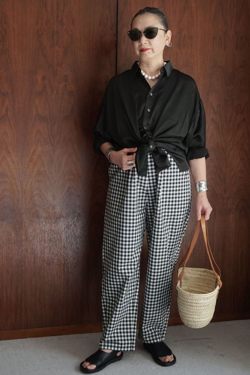 年齢を問わず愛されるギンガムチェックのワンピースとパンツです。黒と白のシンプルな配色は、装いをすっきりと見せてくれるだけでなく、