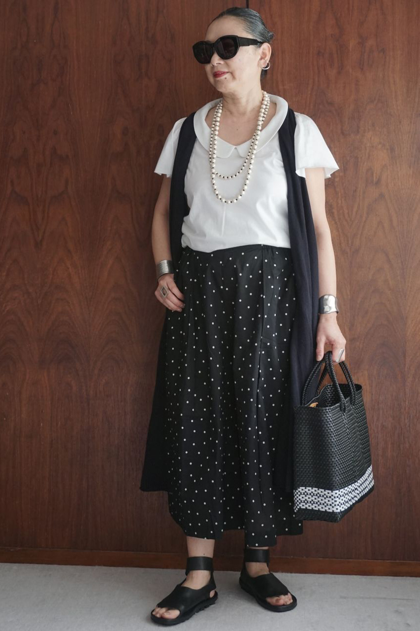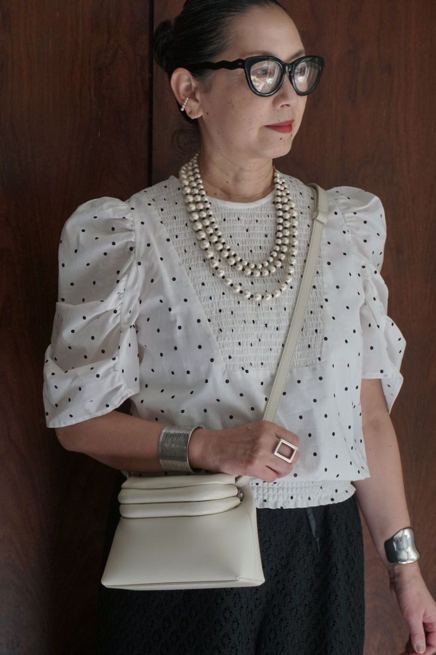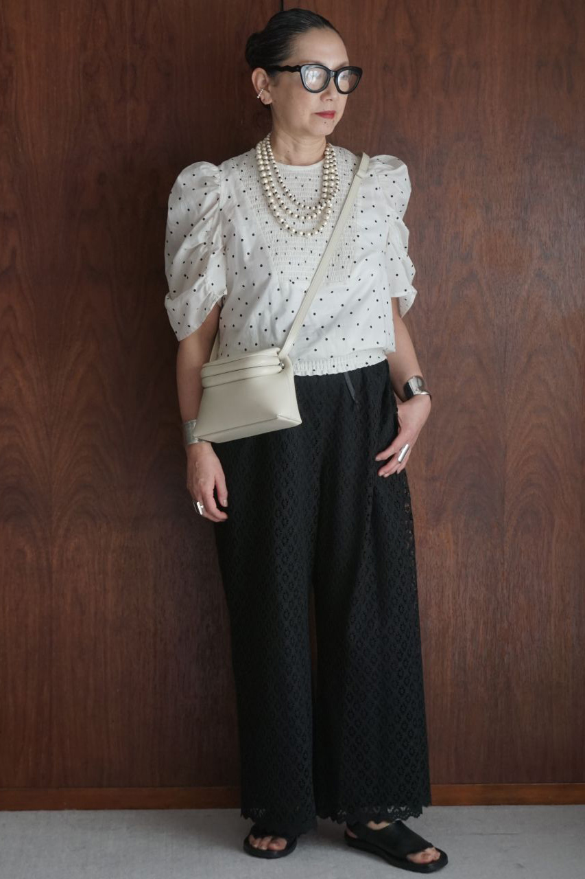 1枚できちんと華やぐ、立体感のある美しいシルエットのパフスリーブブラウスと、ラクに着られてきれいに見える、大人の毎日にちょうどいいワイドキュロット。クラシカルな印象のドット柄も、モノトーンだから甘くなりすぎず、大人にちょうどいいバランスに。