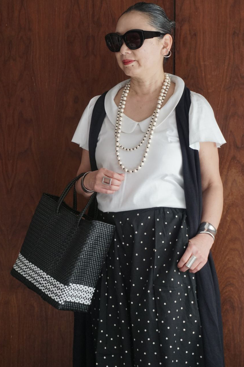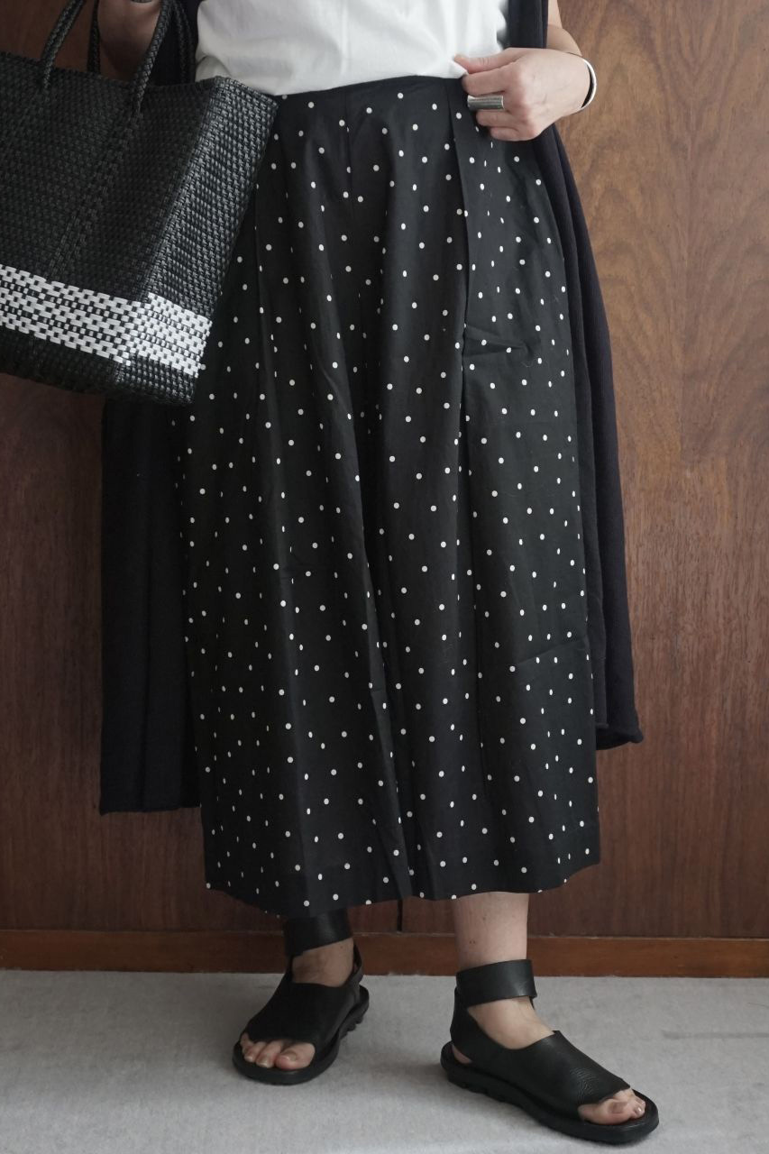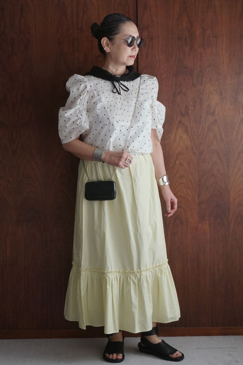 1枚できちんと華やぐ、立体感のある美しいシルエットのパフスリーブブラウスと、ラクに着られてきれいに見える、大人の毎日にちょうどいいワイドキュロット。クラシカルな印象のドット柄も、モノトーンだから甘くなりすぎず、大人にちょうどいいバランスに。