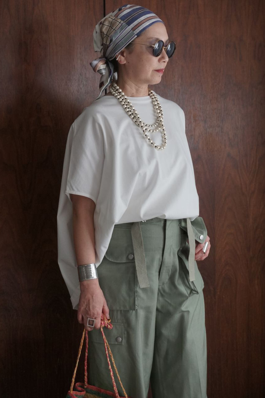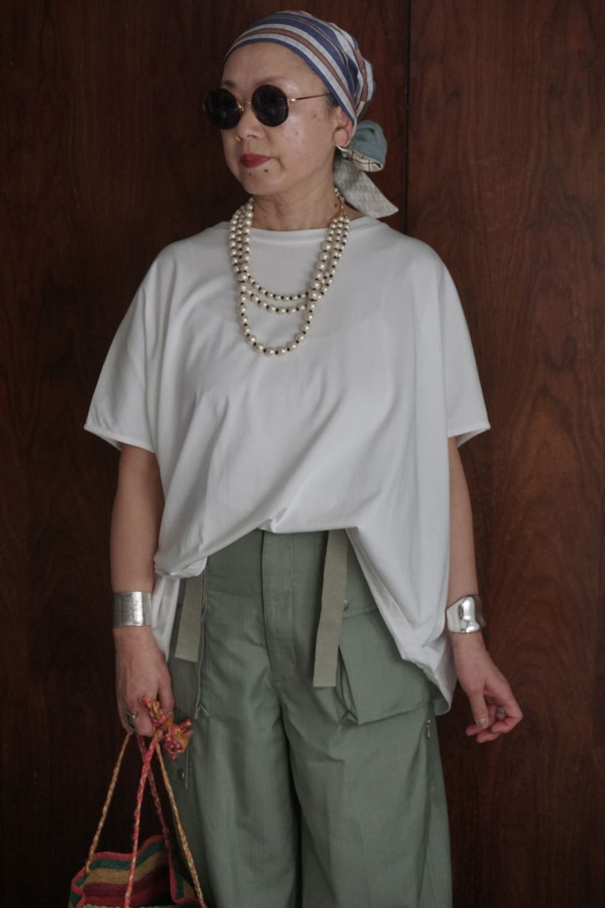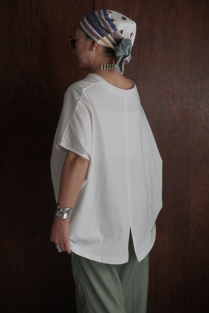 ラウンドカラーがクラシカルな雰囲気のオーガニックコットン素材のラウンドカラーTシャツは、子供っぽくならないように胸元の程よいあきや袖のフリルで抜け感を出しました。大人の甘さを演出しながらブラウス感覚で着用でき、スカーフやアクセサリーで印象を変えられ、どんなボトムにも合わせやすいデザイントップスです。ワイドTシャツは、体型をひろわないワイドなシルエット。ルーズにみえない絶妙な袖の丈感やバックスタイルのデザインなど、ゆるさがちょうどいい大人の「余白」Tシャツです。