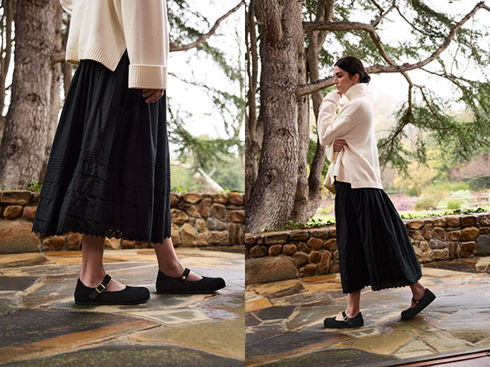 定番のメリージェーンをカントリーライクに再解釈した“Mantova”は、素朴さとモダンさが絶妙に融合した一足。裁ち端の風合いを生かした裏地なしの仕上げが、ナチュラルな雰囲気を引き立てます。アッパーには柔らかなスエードレザーを使用し、足にしっとりと馴染むフィット感。きらりと光るスクエアシェイプのバックルが、さりげないアクセントに。天然ゴムを混合したコルクフットベッドとスエードレザーの中敷が、快適さと品格を両立。