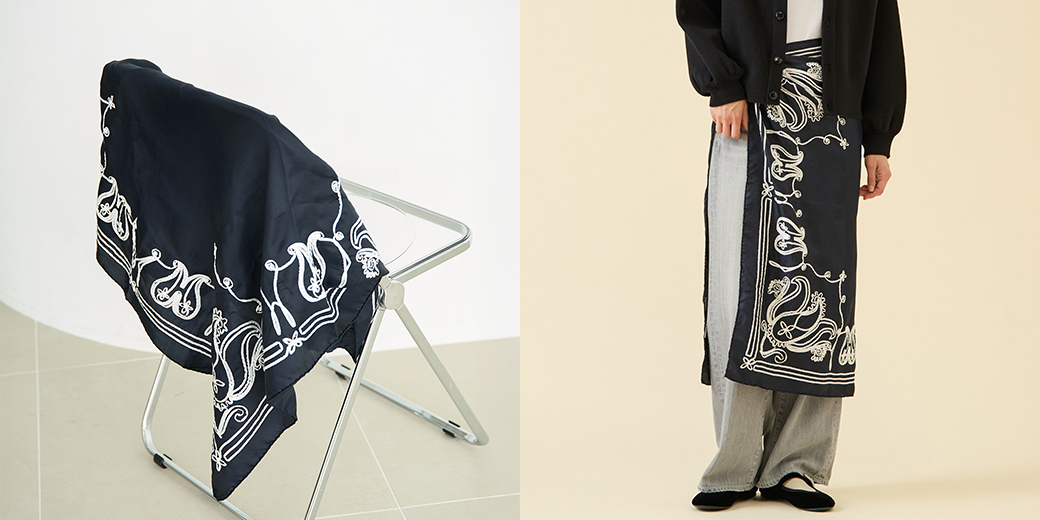 ヴィンテージのバンダナ柄をコード刺繍を使ってシルクスカーフにモディファイされた「アソースメレ」の人気アイテム テープエンブロイダリーバンダナスカーフ。「マルティニーク」のブランドカラーであるNAVYが別注カラーで登場。バイカラーのシンプルな配色ながらテープの立体感が豊かな表情を生み出しスタイリングのアクセントに。