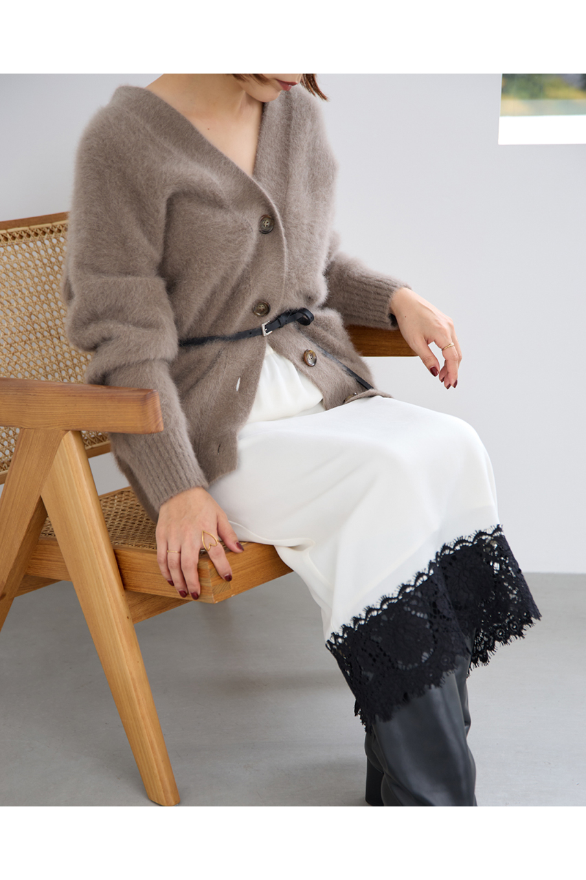 定番のFOXファーカーディガンは、アウター感覚で羽織れるサイズ感。ベルトでウエストマークしてバランス調整するのも◎