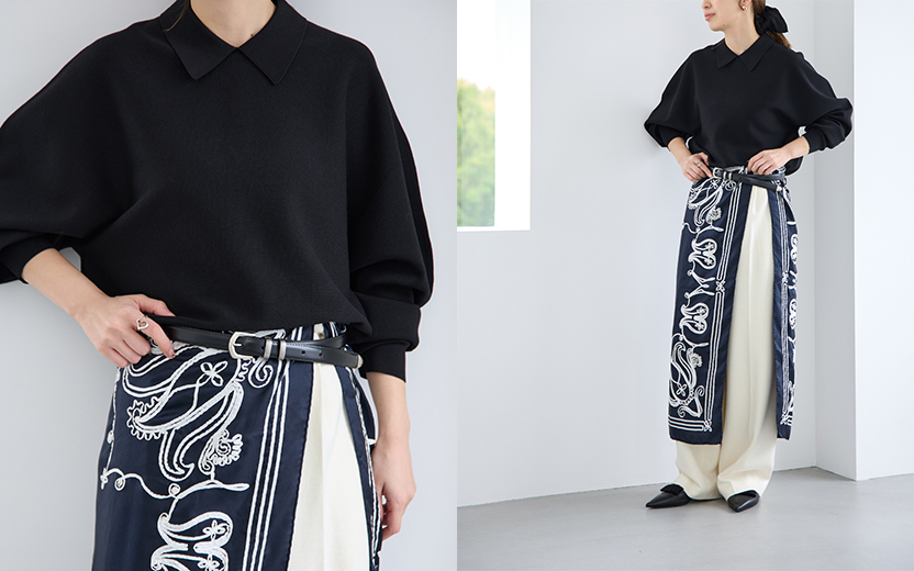 ブラウスライクなデザインニット。襟付きできちんと感もあり、袖をプッシュアップすると袖のシルエットが引き立ちます。