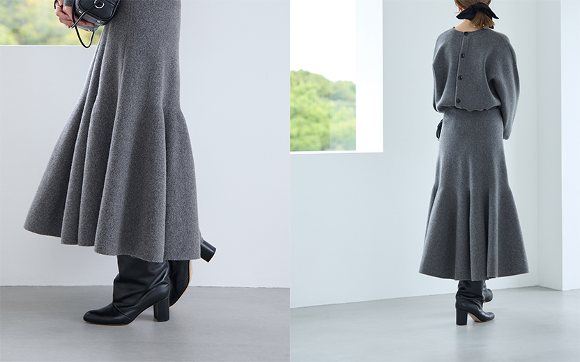 ミラノリブのニットセットアップ。真冬まで活躍する肉感と適度なハリで、袖のボリュームやスカートのフレアシルエットがポイントです。トップスはフロンタブルで、前をボタンにカーディガンとしても◎