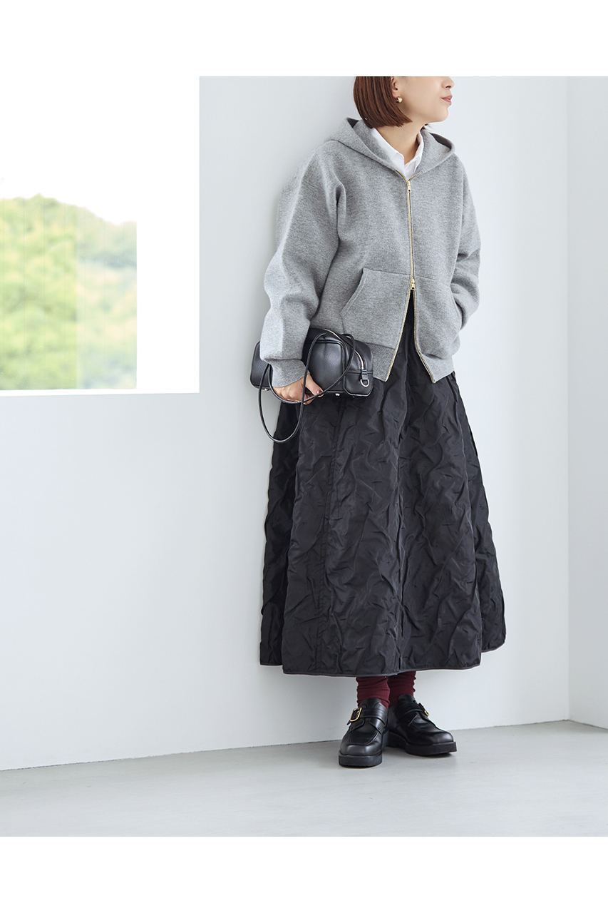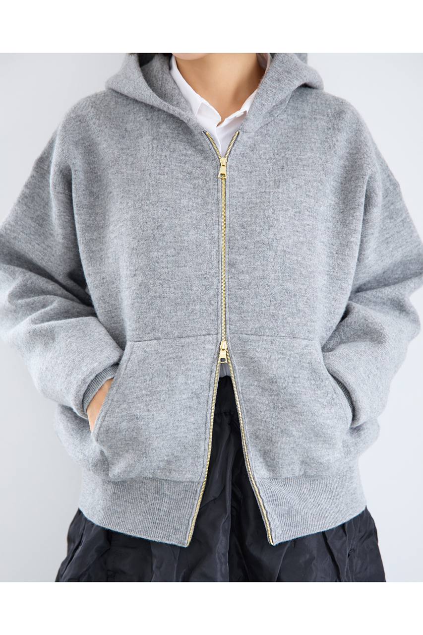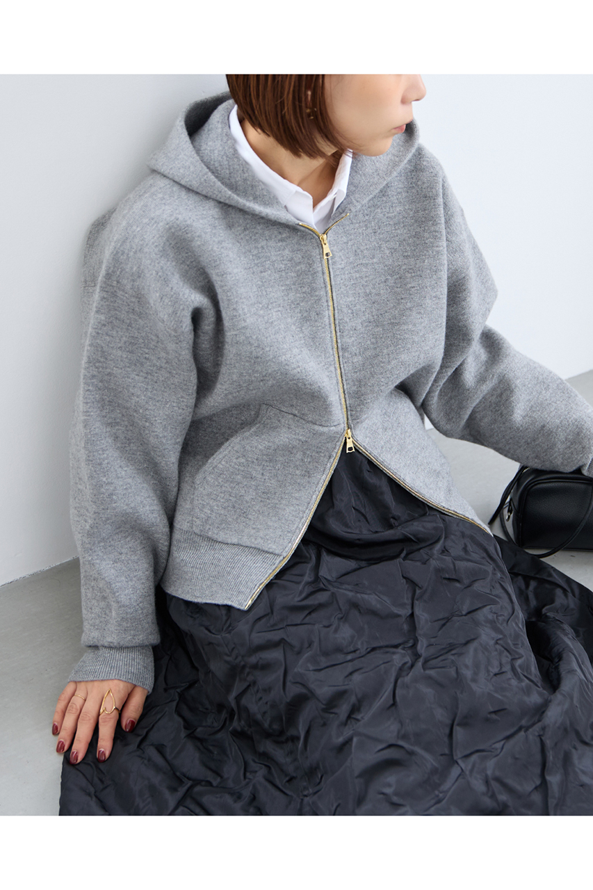 カジュアルになりすぎずに着られる絶妙なサイズ感のダブルフェイスニットパーカー。ゴールドのダブルジップが女性らしさをプラスし、ボトムスに合わせてバランスを調整できるのでボトムスを選ばずに着ていただけます。