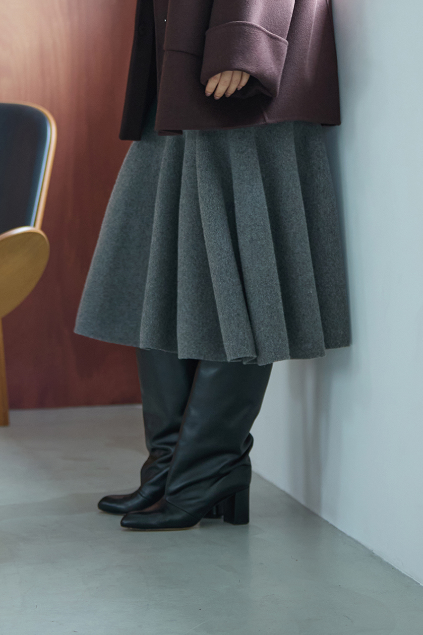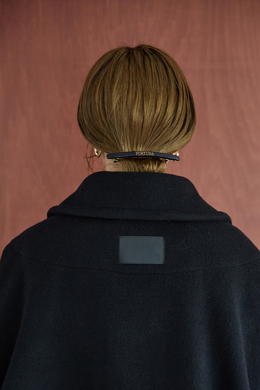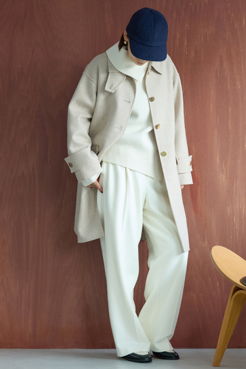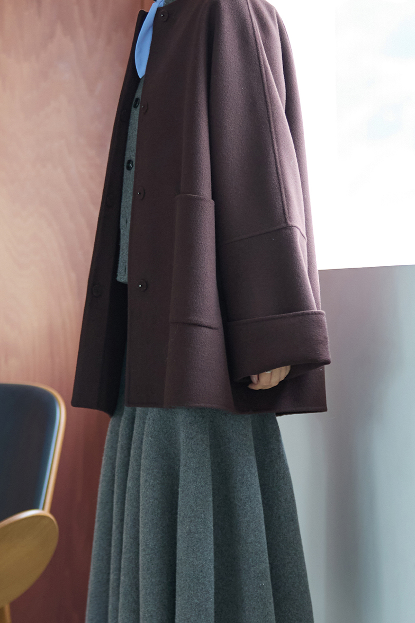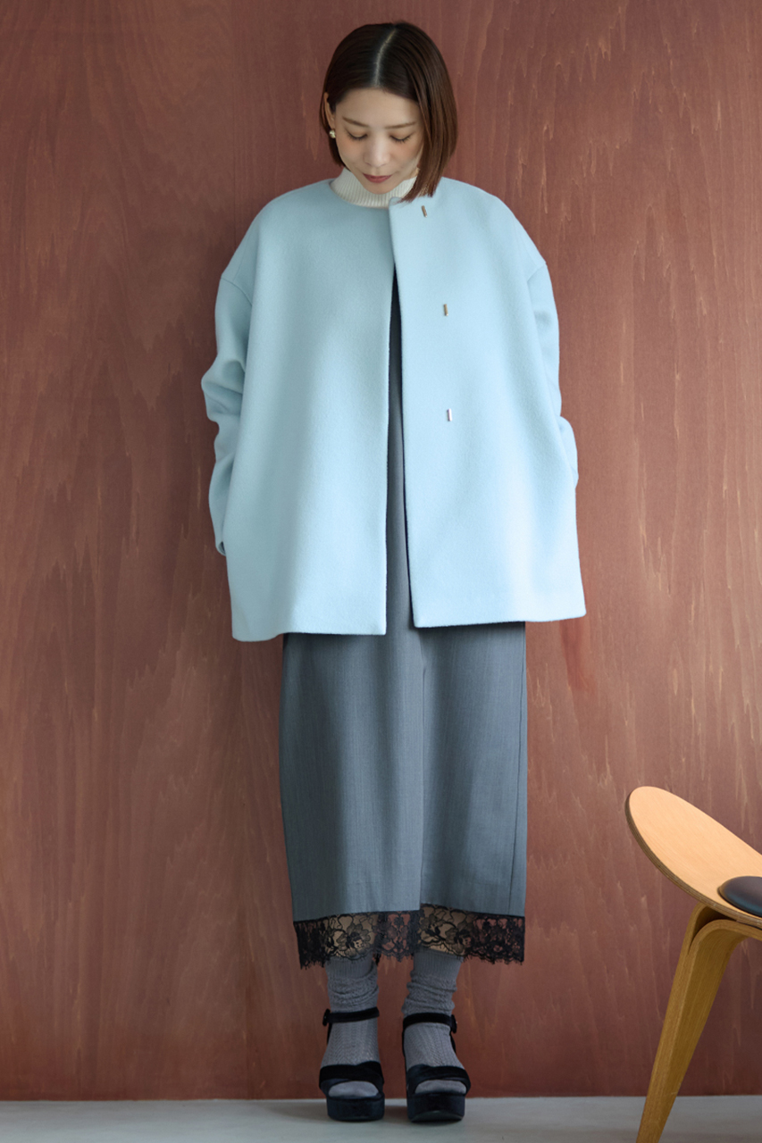 ノーカラーで直線的な襟元が特徴のコート。ボクシーなシルエットがモダンで抜け感のある印象を与えます。フロントは金属ホックでシャープに仕上げ、ミニマルながらも存在感のあるデザインに。