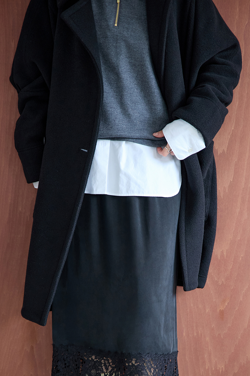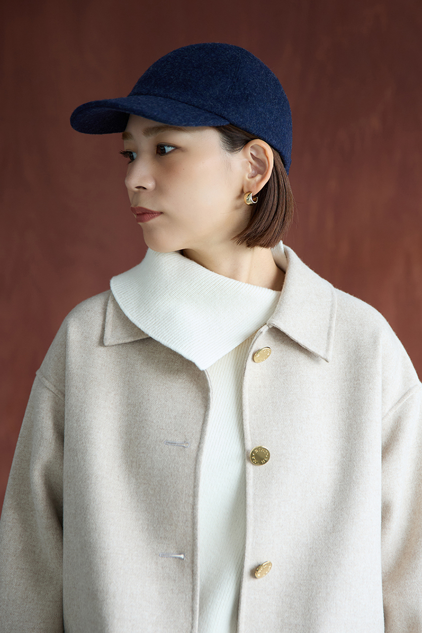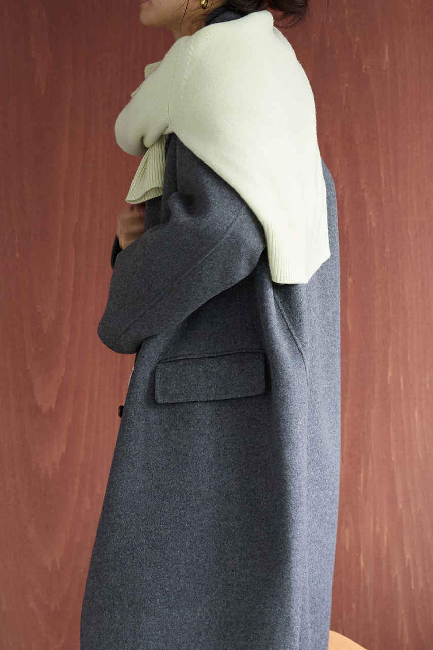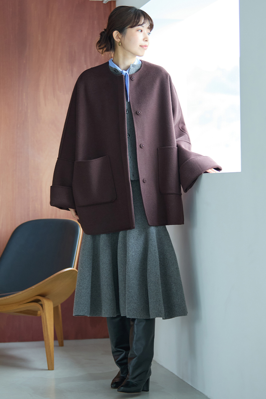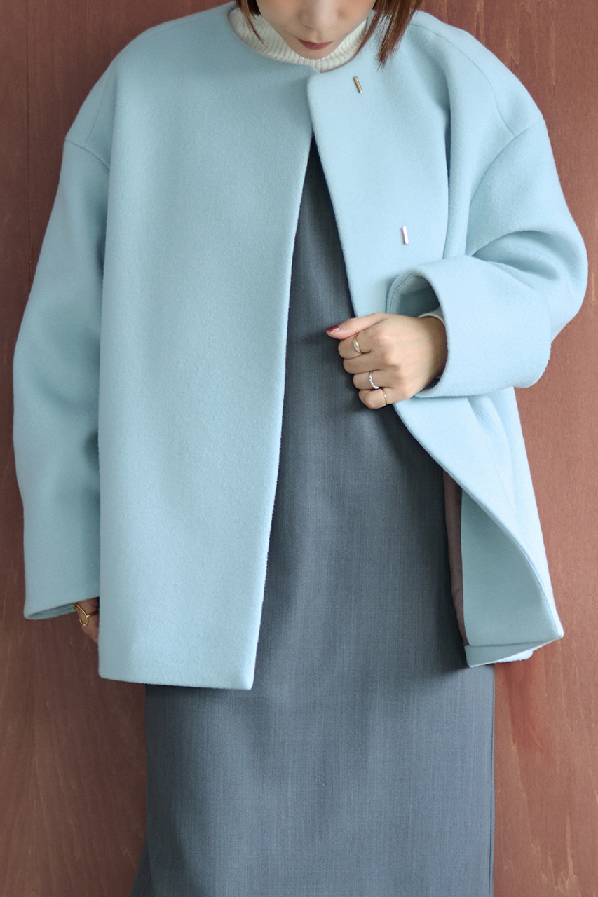 Super120'sのリバー素材を使用したポンチョのようなノーカラーコート。お尻下丈で様々なボトムと合わせやすい丈感です。