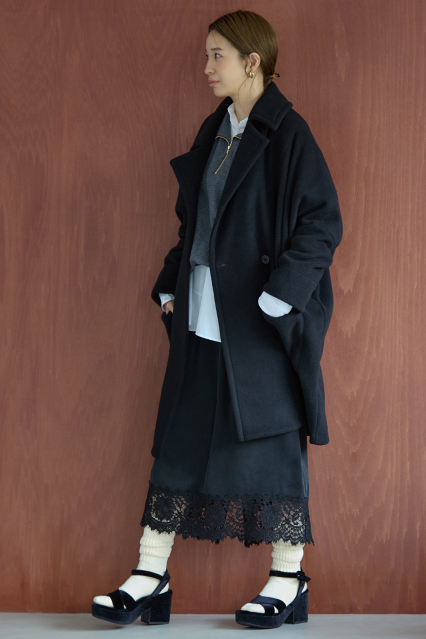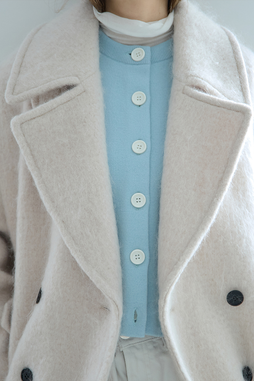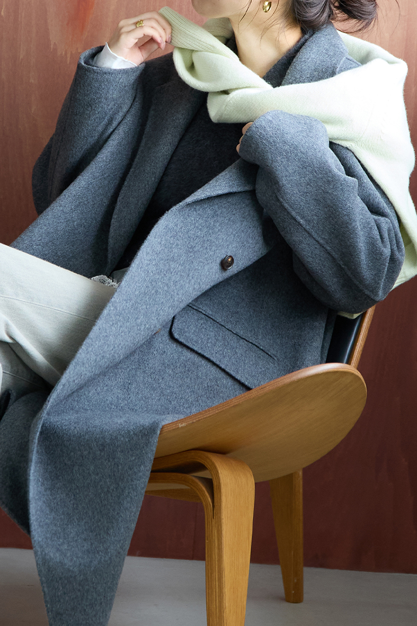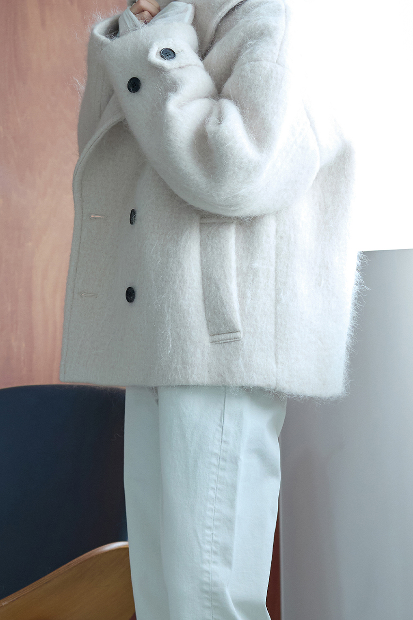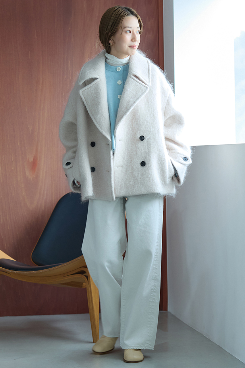 クラシックなピーコートに、大きめラペルと程よいビッグシルエットを加えることで、上品さと今らしさを両立させたシャギーコート。上質な素材と洗練されたディテールが、カジュアルからきれいめまで幅広いスタイルにマッチ。