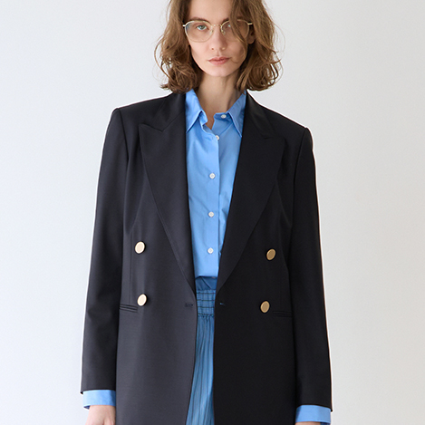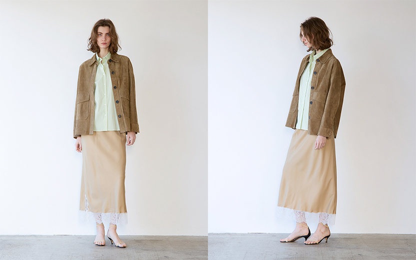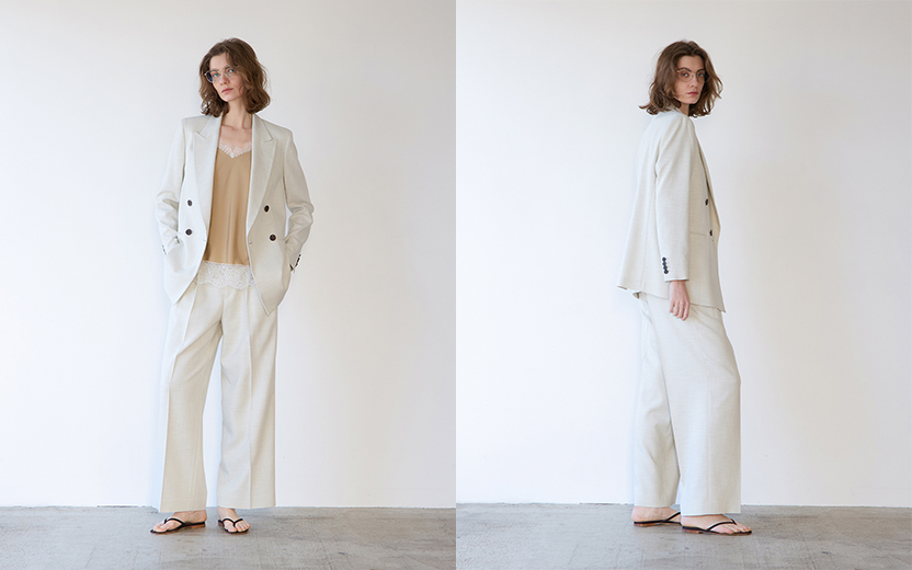 定番のESSENTIAL JKセットアップ。ポルトガルのRIOPELE社のバスケット素材を使用した新色、エクリュが登場。上品な光沢感、自然なスラブ感が高級感のある表情を演出しています。インナーに合わせたリバーレースキャミが旬なスタイリング。
