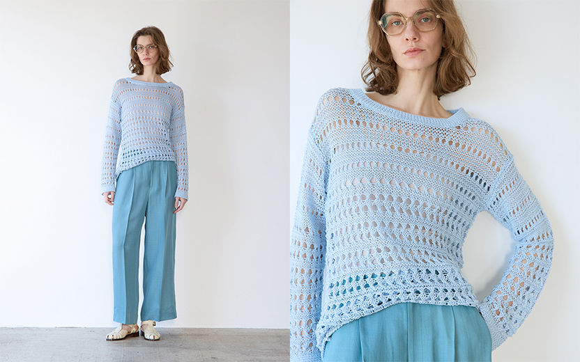 ペーパー混のコットンシルクの軽い糸を使用して、さっくり編んだ軽やかなメッシュニット。サックス×ミントグリーンの組み合わせが新鮮です。