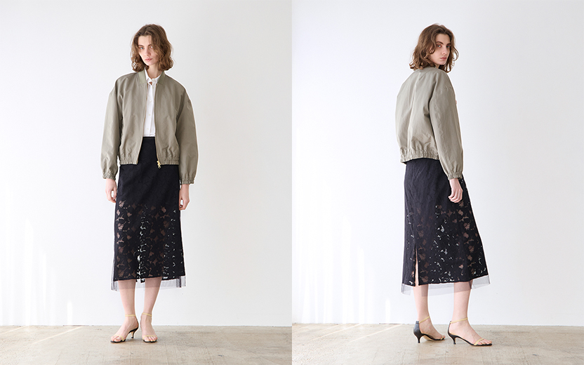 リバーレースを贅沢に使用したバイヤススカート。裾の脇には細幅レースをあしらい、繊細なアクセントを添えた上品なデザインに。カジュアル過ぎない程よいツヤ感が上品な印象に。
