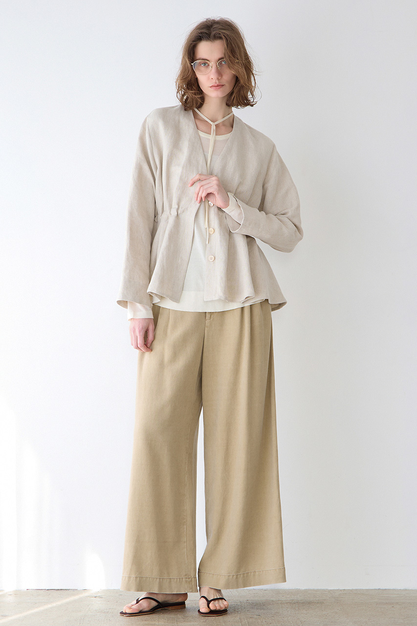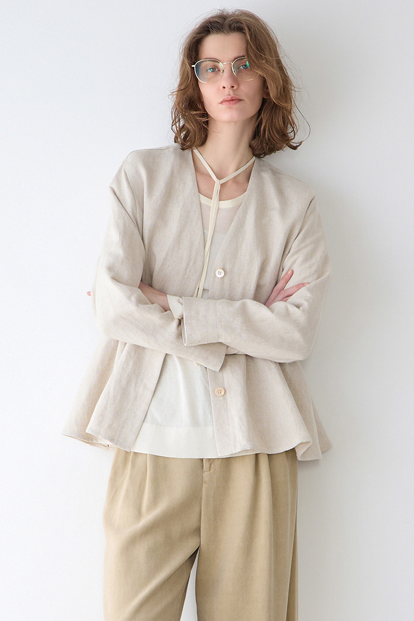 しっかりと厚さのある柔らかいリネンを使用したタック&フレアーの前あき仕様でドルマンスリーブでリラックス感のあるソフトリネンタックジャケット。ジャケットとブラウスの中間のような使い勝手の良い羽織ブラウスです。