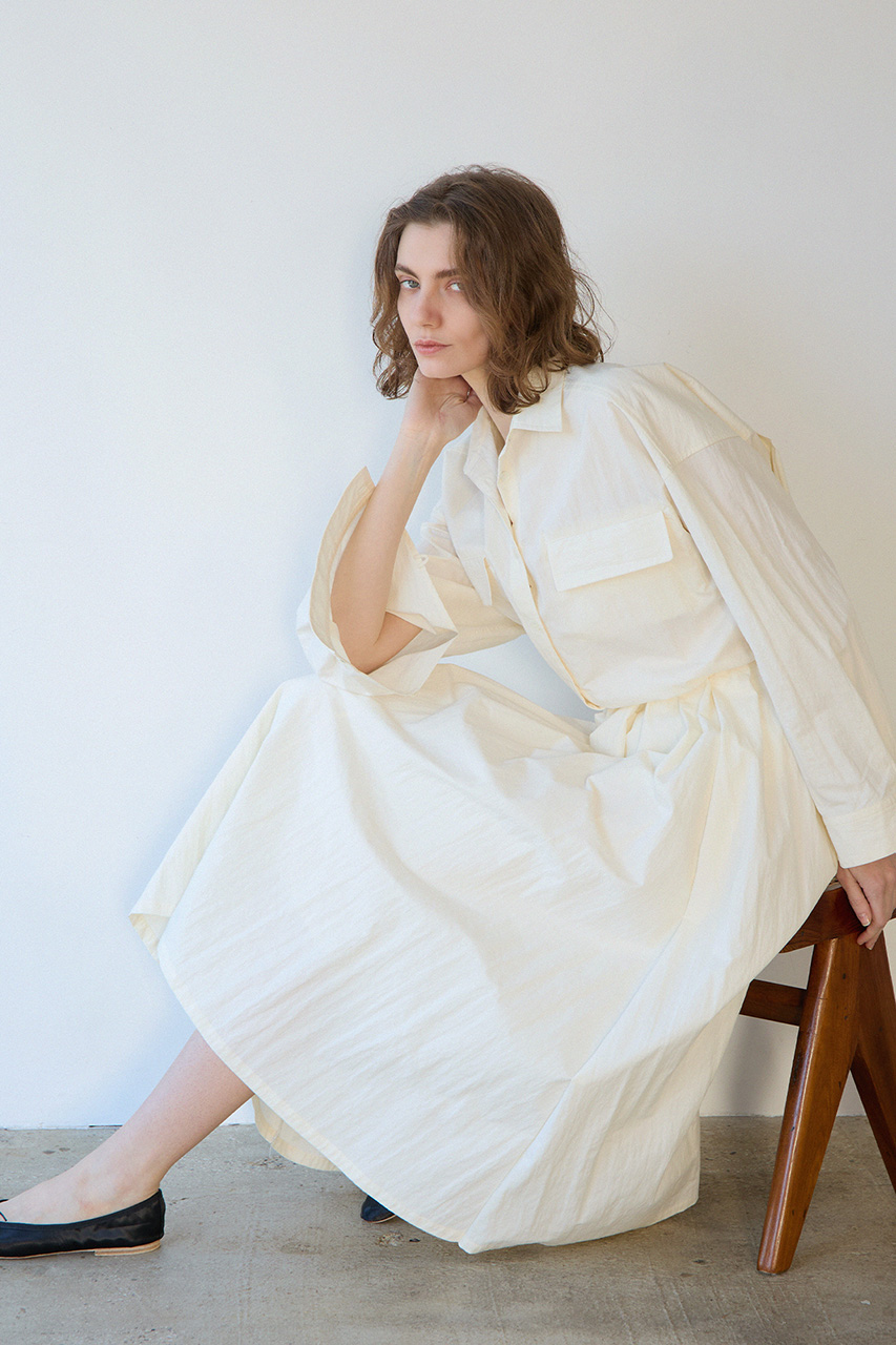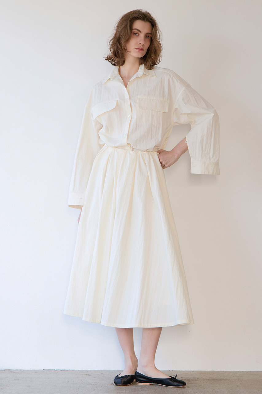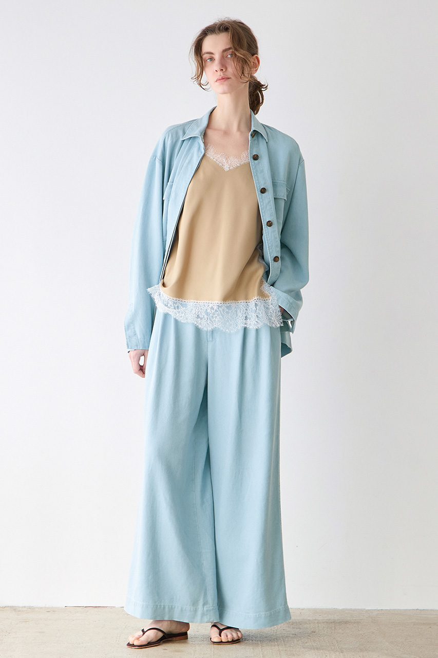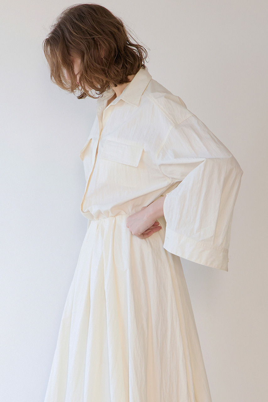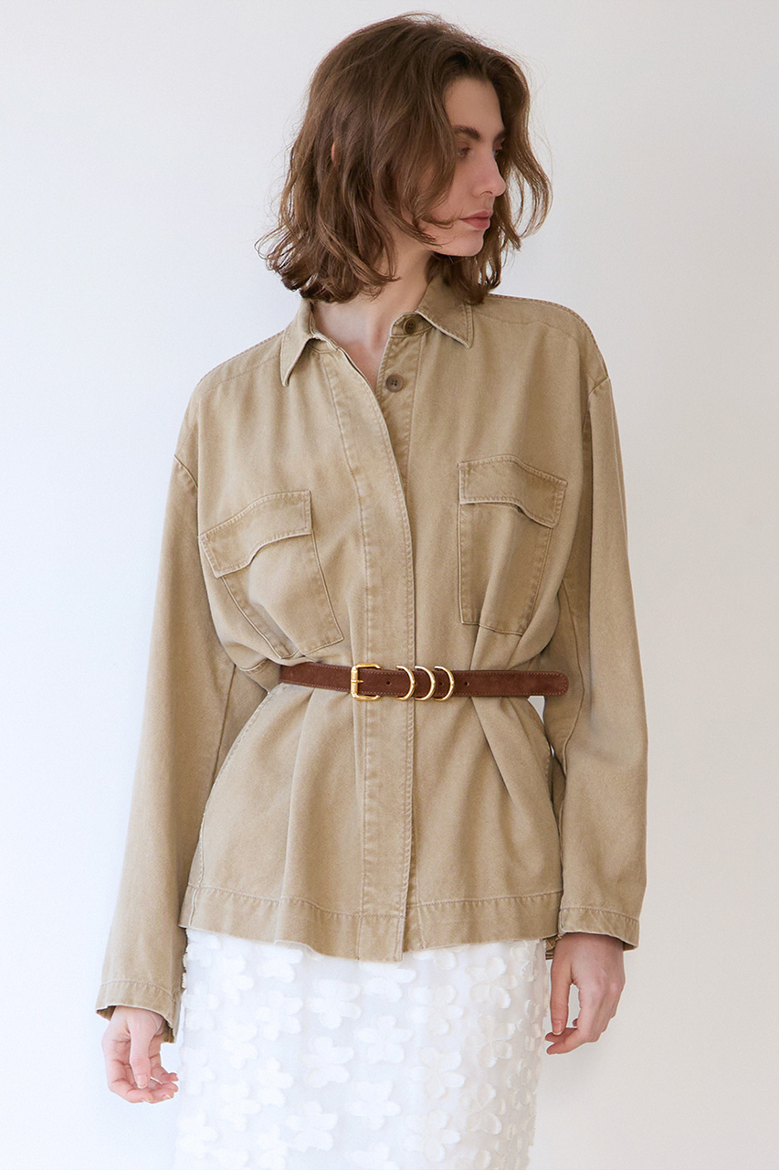 テンセル素材に顔料で染めることで女性らしい柔らかな風合いとオチ感に加え、程よいヴィンテージ感を表現した素材使いのセットアップ。ミリタリージャケットをベースに、ディテールを都会的に洗練させたシャツブルゾンは、フラワージャガードスカートにベルトを巻いてすっきり着こなすのもおすすめ。