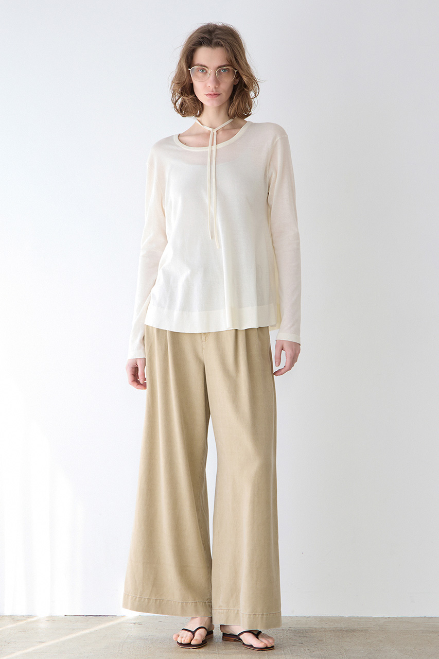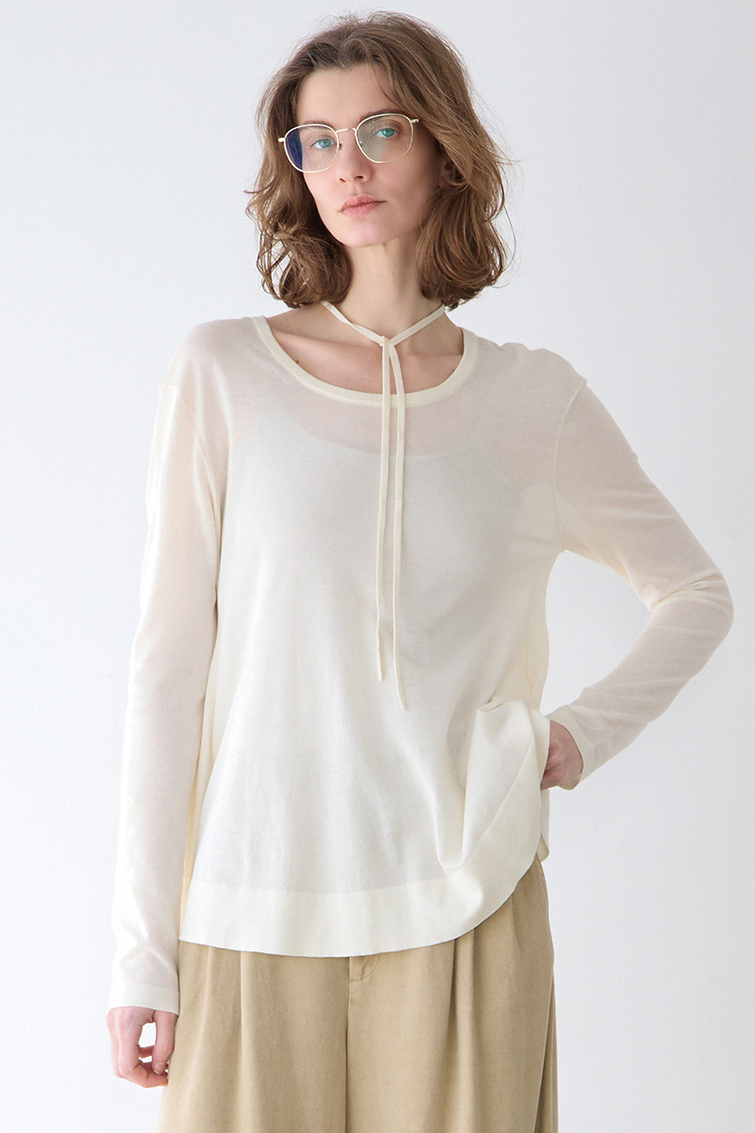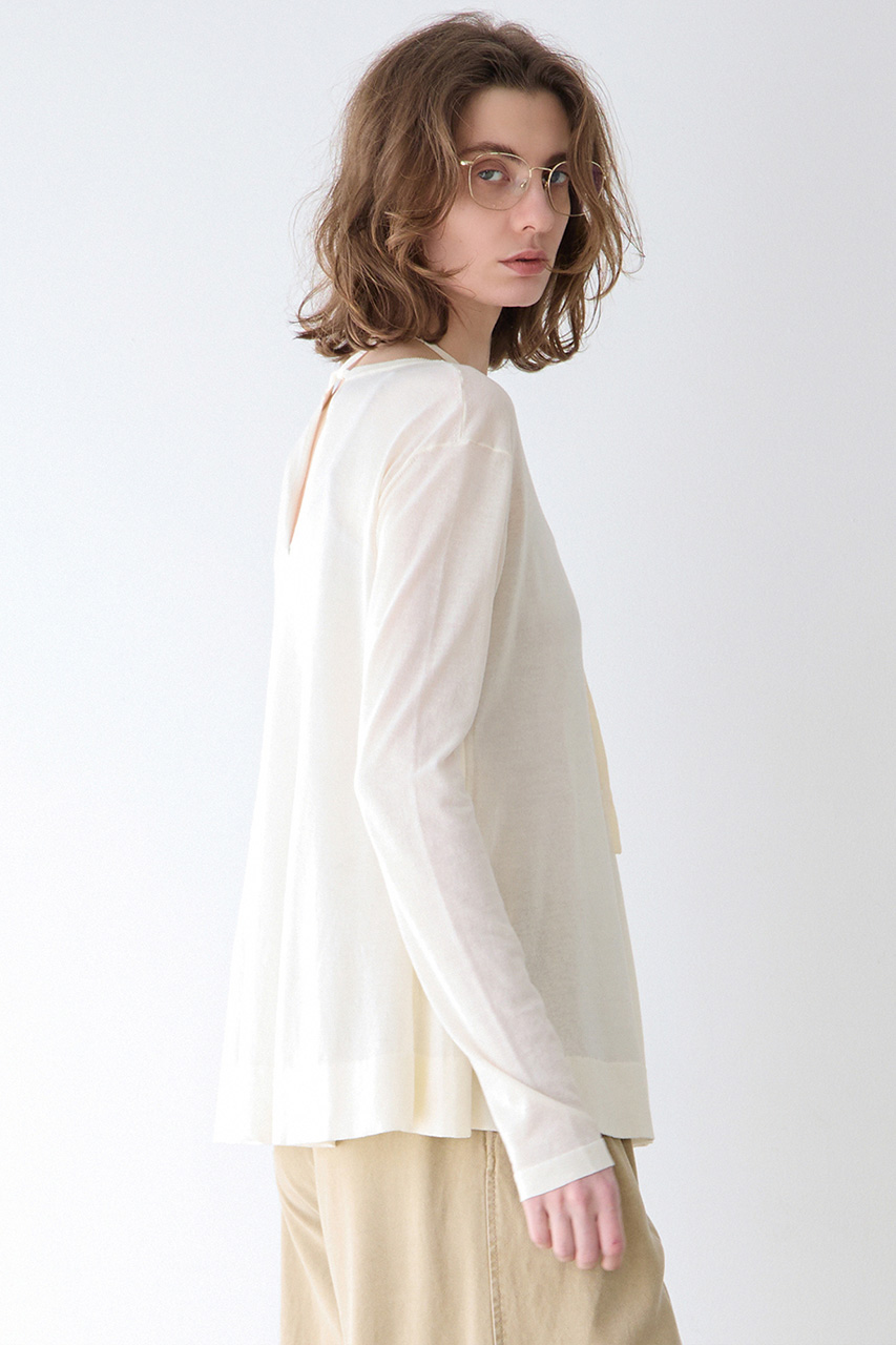 繊細な糸で編みたてた、フレアーな裾が気分なシアーぺプラムプルオーバー。後ろに伸びる紐は、後ろで結ぶのはもちろん、前に回してチョーカーのようにしても。