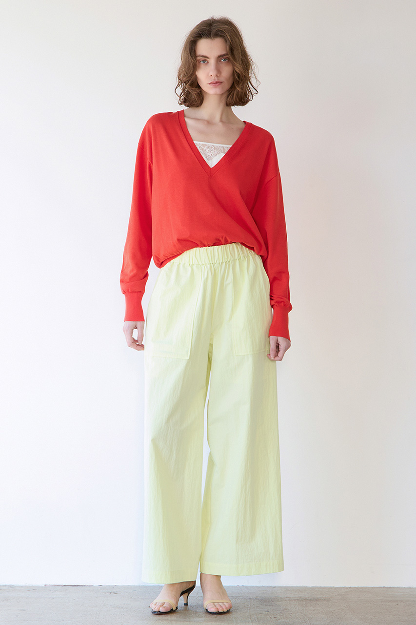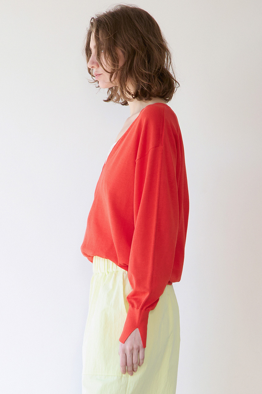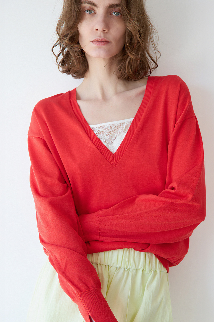 スッキリした衿あきがヘルシーなVネックプルオーバー。鮮やかな発色のシルク混の糸を使用し、シルクの上品な光沢と程よい落ち感で、シンプルながらもフェミニンなムードです。