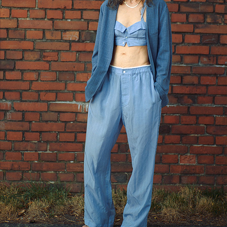 今シーズンのテーマでもある"Happiness for living"肌触りの良いウェアでリラックスすることも1つのキーワード。パジャマライクな要素を盛り込んだアイテムを提案しています。ウエスト部分はアンダーウェアをレイヤードしているようなデザインのパジャマパンツ。Vintageのアンダーウェアから着想したディテールデザイン。