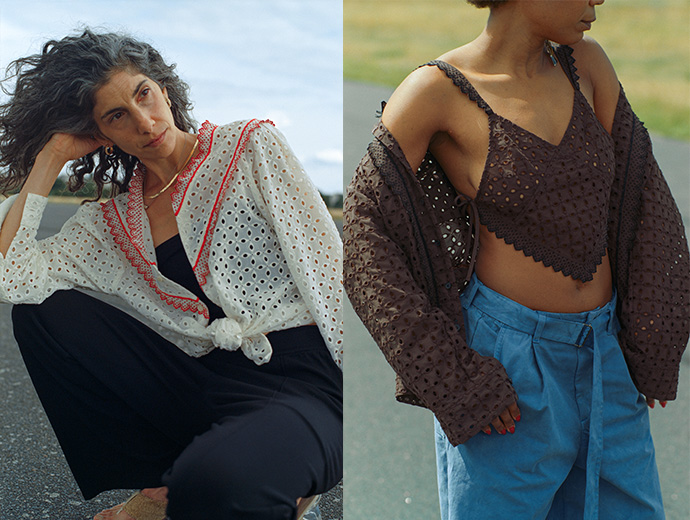 Happyなシーンで着用していたであろうフランスで出逢ったVintageのレース刺繍のキャミシール。そのレース刺繍素材をベースにリプロダクト。コットンベースではなくコットンキュプラをベースにして適度なハリ感を持たせ、大人が着れるアイテムにしています。