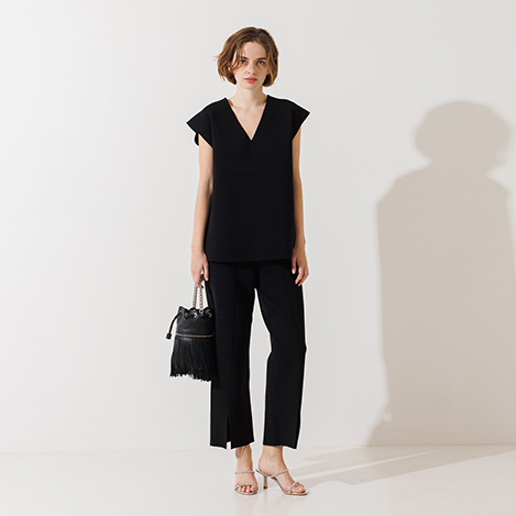 ニットパンツはセンタータックが入ったきれいめ見えするアイテム。ストレッチが効いているのではき心地も抜群です。裾に向かって少し広がったシルエットで、シューズを選ばずにコーディネートできるところも◎。