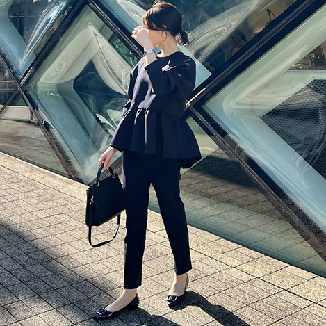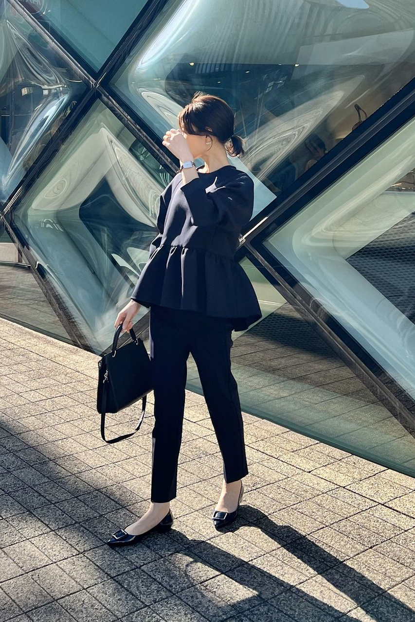 まず、金子さんが披露してくれたのは、ネイビーでまとめたワントーンコーディネート。「卒入学などのセレモニーや学校行事、ママ友ランチまで、上品さが求められるシーンが多い春にぴったりの着こなし。甘めのペプラムトップと、ポインテッドトウがレディな“NINA”を合わせることで、シックに傾きがちなネイビーコーデがぐっと女性らしい印象に仕上がります」。