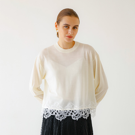 裾に繊細なレースをあしらったデザインニットは、1枚で着映えするアイテムです。今年らしいショート丈のシルエットで、スカートやパンツとも相性がよく、どんなボトムにも合わせやすい万能なニットです。