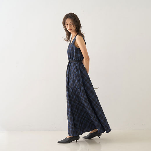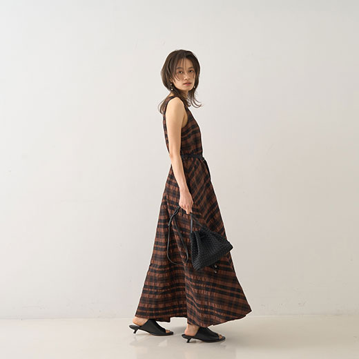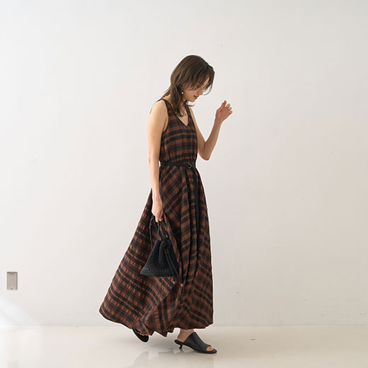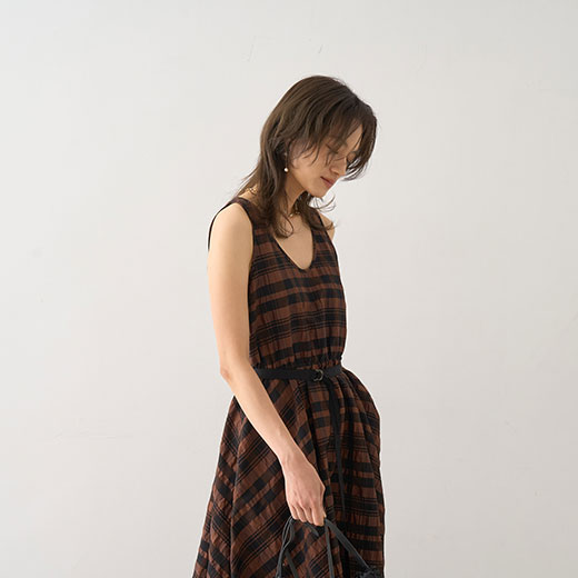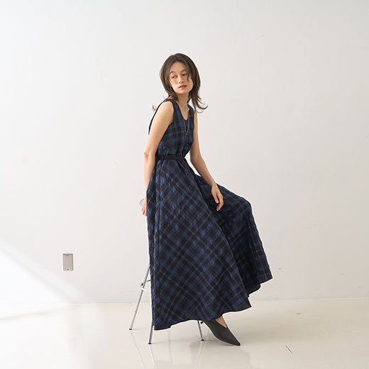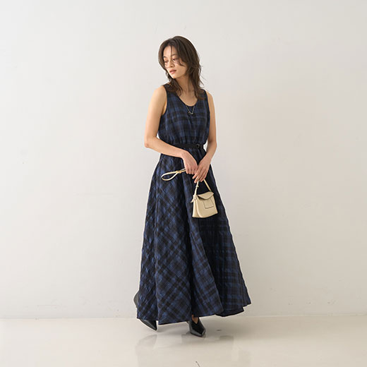 夏らしい爽やかさを纏える、シアサッカー調のビッグチェックワンピース。凹凸のある素材が肌に張りつきにくく、軽やかで涼しい着心地を実現。見た目にも涼やかなチェック柄が、夏の装いに華やかさを添えてくれます。