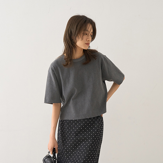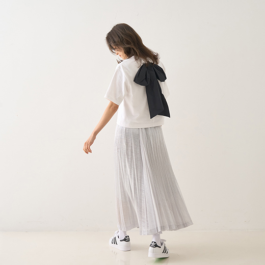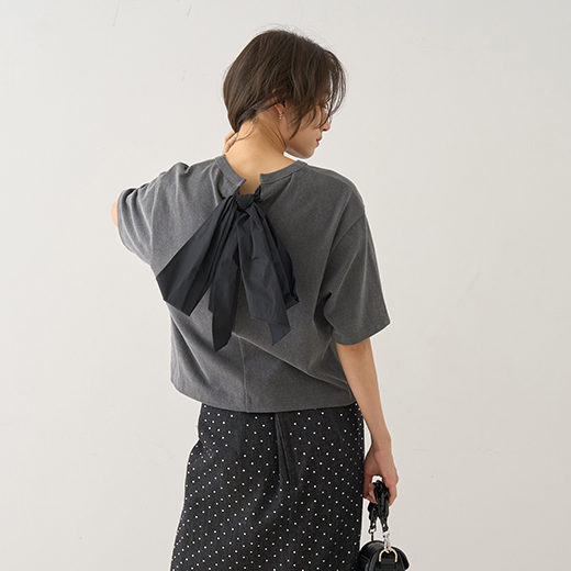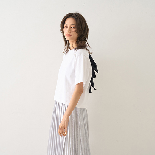 ナチュラルな風合いが魅力のコットン天竺素材を使用した、大人のためのカジュアルTシャツ。ホワイトとヴィンテージ感漂うグレーの2色展開で、こなれた印象に仕上がっています。後ろ襟元には、ハリのあるタフタ素材のリボンをあしらい、バックスタイルにさりげないアクセントをプラス。