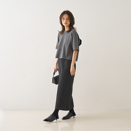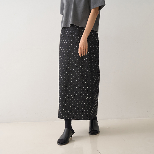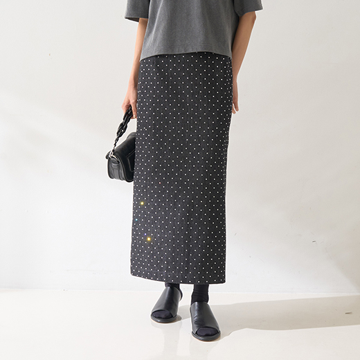 上品な光沢のラインストーンが目を惹くデニムスカート。ハリのある10ozデニム素材を使用し、すっきりとしたIラインシルエットが美脚効果も。歩くたびにきらりと輝くラインストーンが、大人のカジュアルスタイルにさりげないエレガンスと遊び心をプラスしました。
