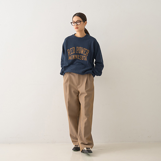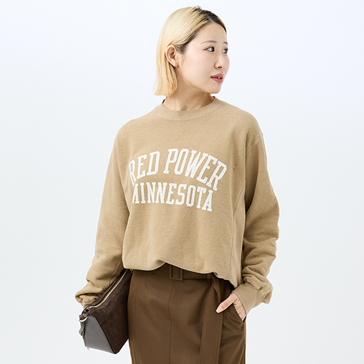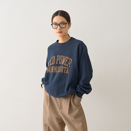 「レミレリーフ」× 「デザインワークス」の別注“RED POWER”スウェット。ヴィンテージ感漂う人気の裏毛ボディに、ブランド定番のロゴを大胆にプリント。この特別な組み合わせが手に入るのは「デザインワークス」だけ。程よいゆるさと加工感が魅力のユニセックス仕様で、デニムやスカートとも好相性。着回し力抜群のアイテムです。