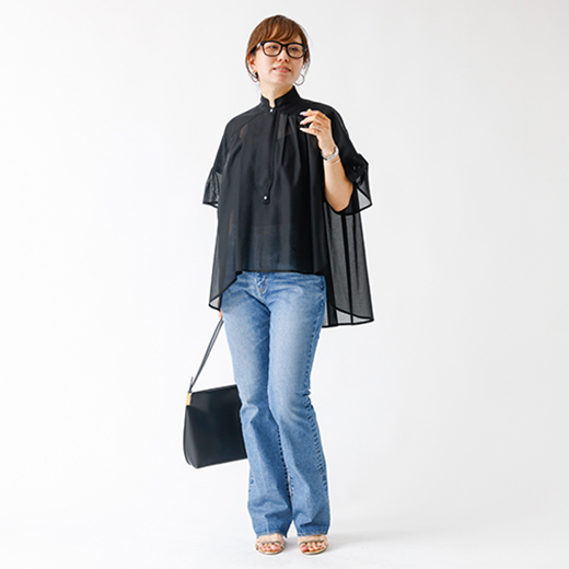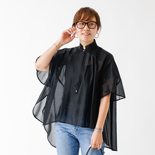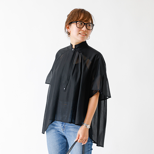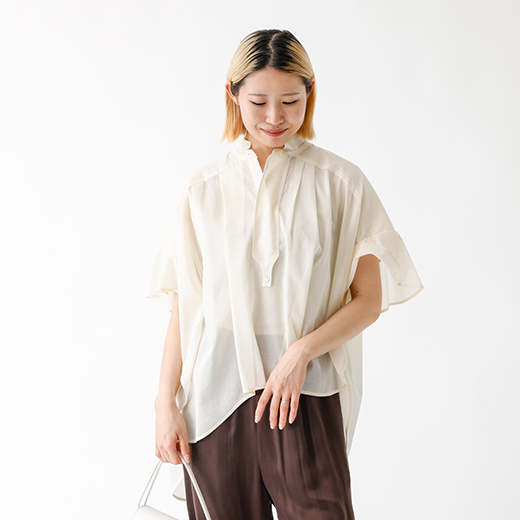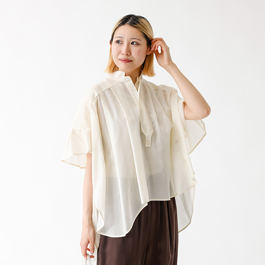 アシンメトリーなラウンドヘムが印象的なデザインブラウス。スキッパーネックが程よい抜け感を演出し、こなれた印象に。袖口のほのかなフレアや背中に施されたギャザーが、女性らしさを引き立ててくれます。タイトスカートを合わせた上品なスタイルはもちろん、デニムを合わせてカジュアルに着こなすのもおすすめです。