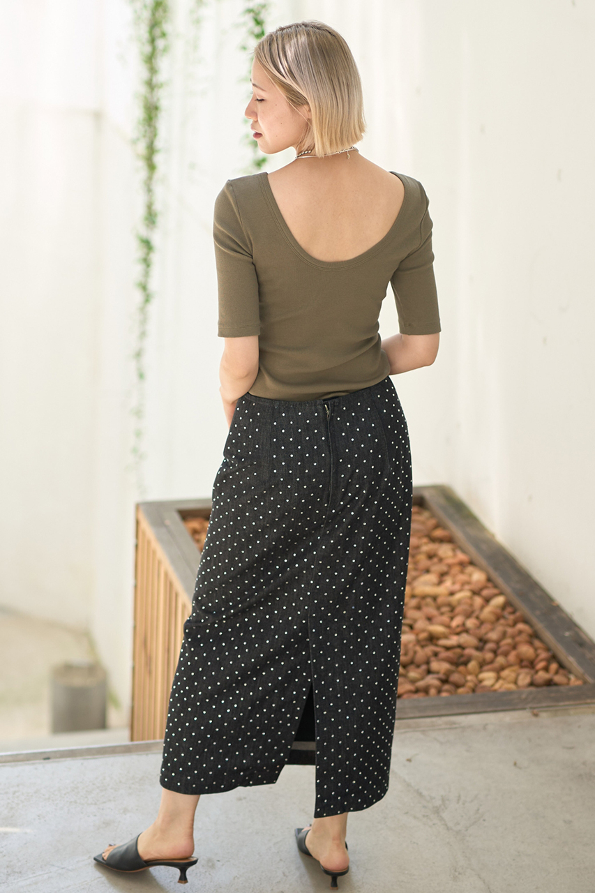 肌離れの良いテレコ素材で、さらりと快適な着心地。バックスタイルは、大胆すぎない程よいカッティングで、ヘルシーな肌見せを演出。女性らしさとモード感が絶妙に融合し、1枚でこなれたスタイルが完成します。