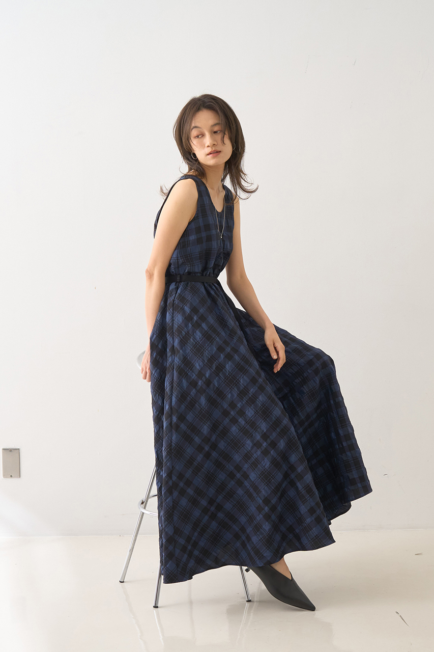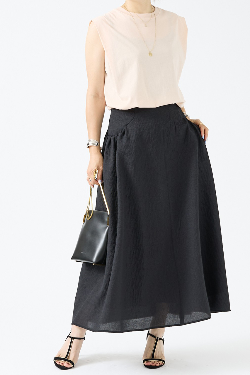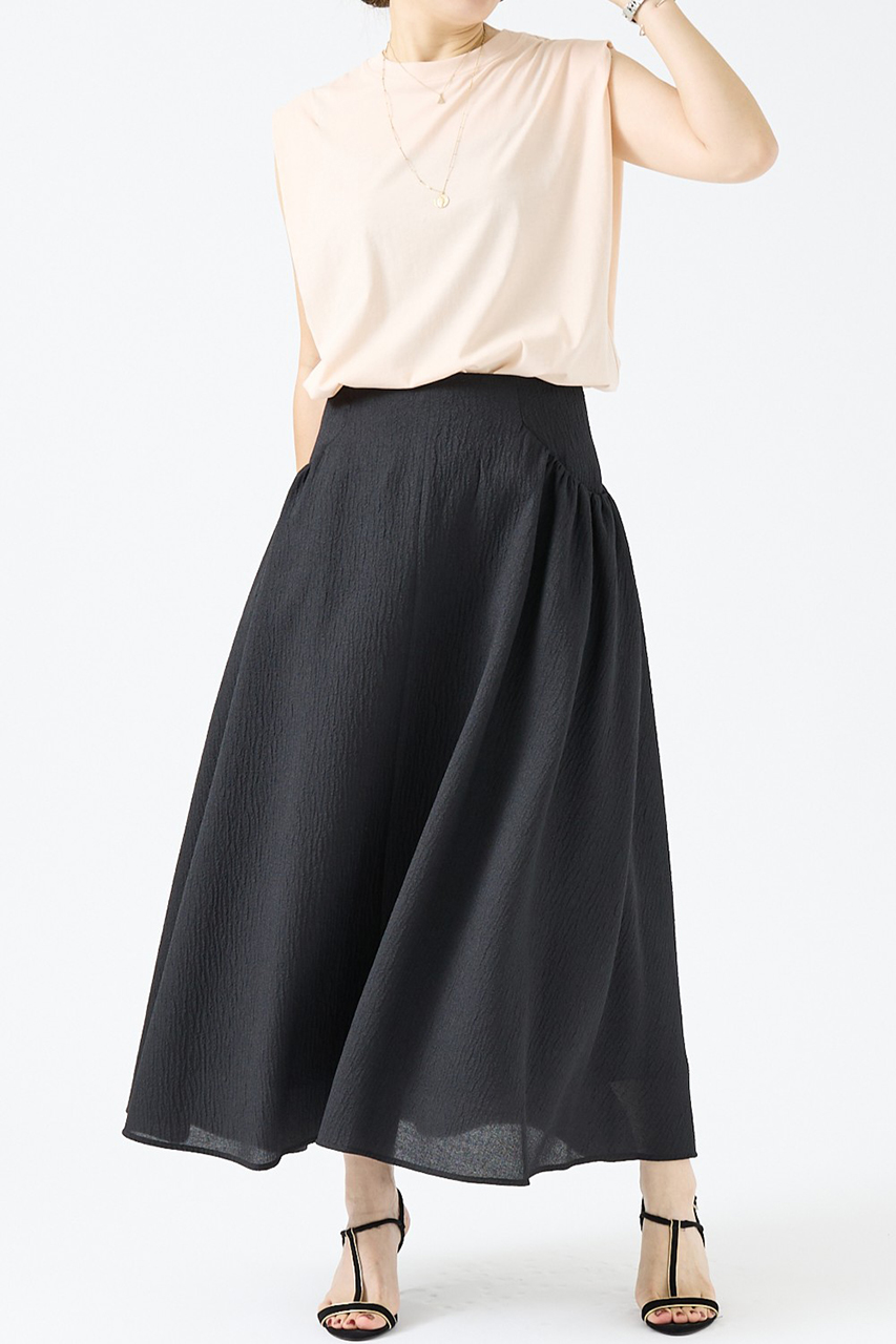凹凸のある素材が肌に張りつかず、軽やかで涼しい着心地を実現。たっぷり広がるフレアスカートの美しいシルエットが、動くたびにドラマティックな印象を与えます。