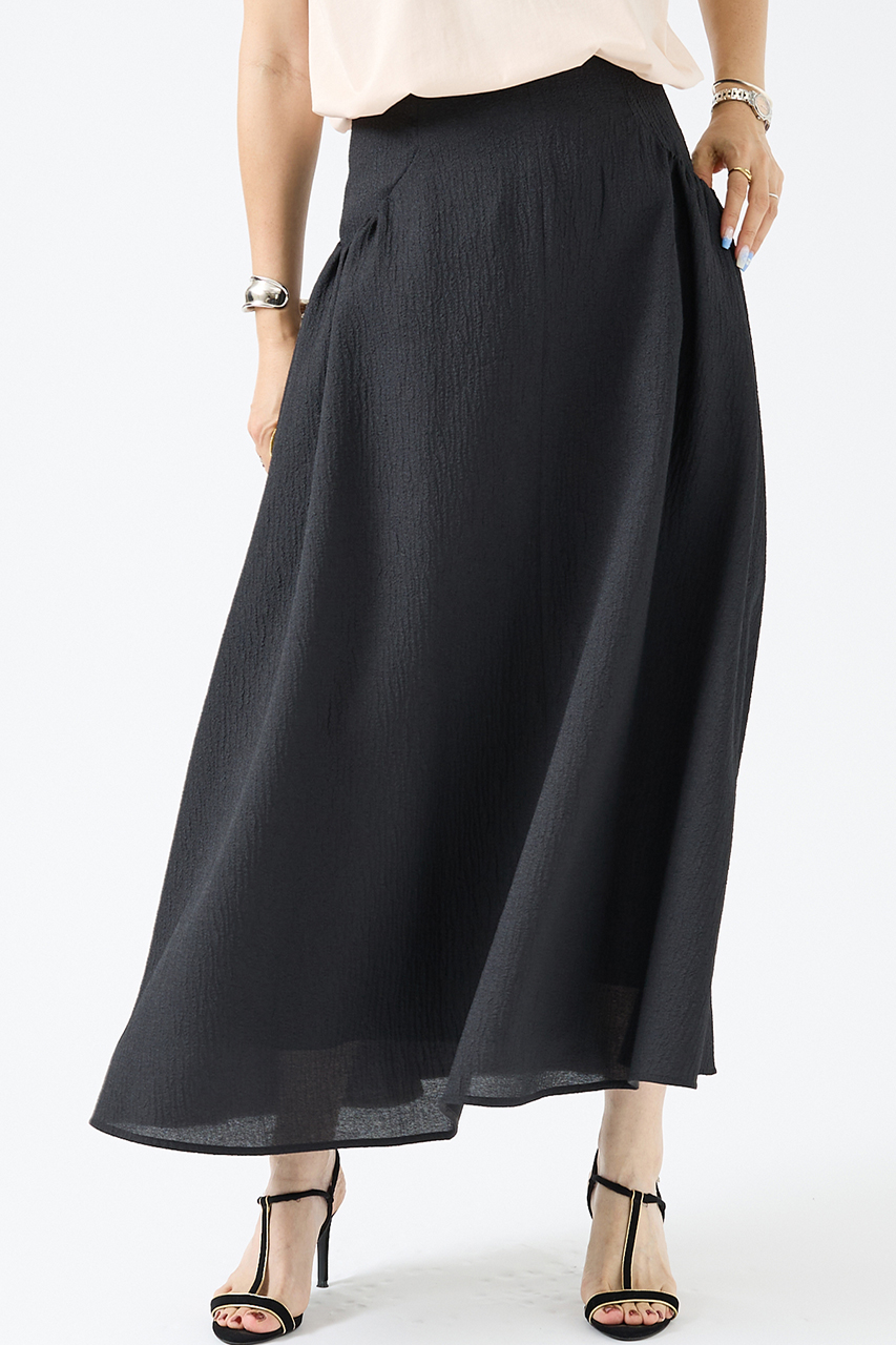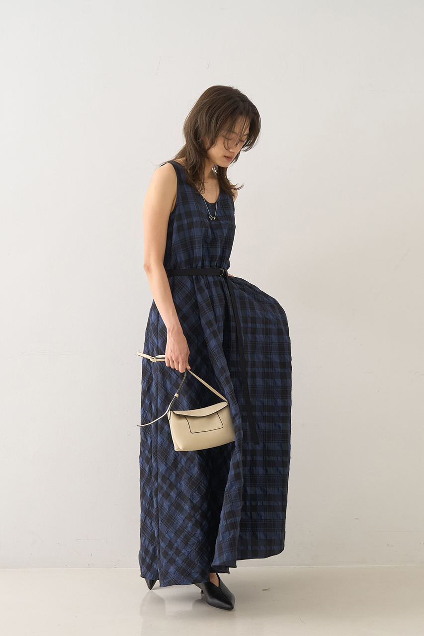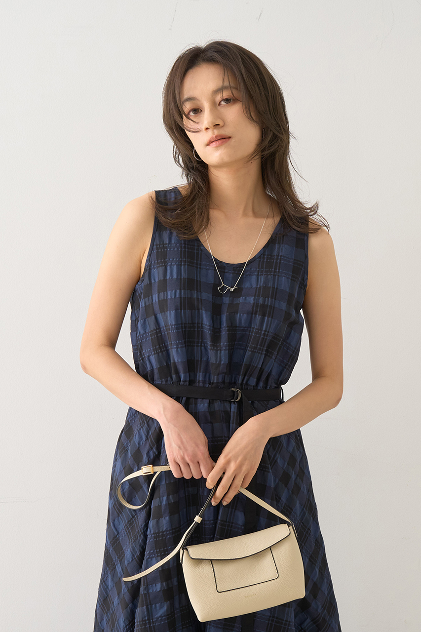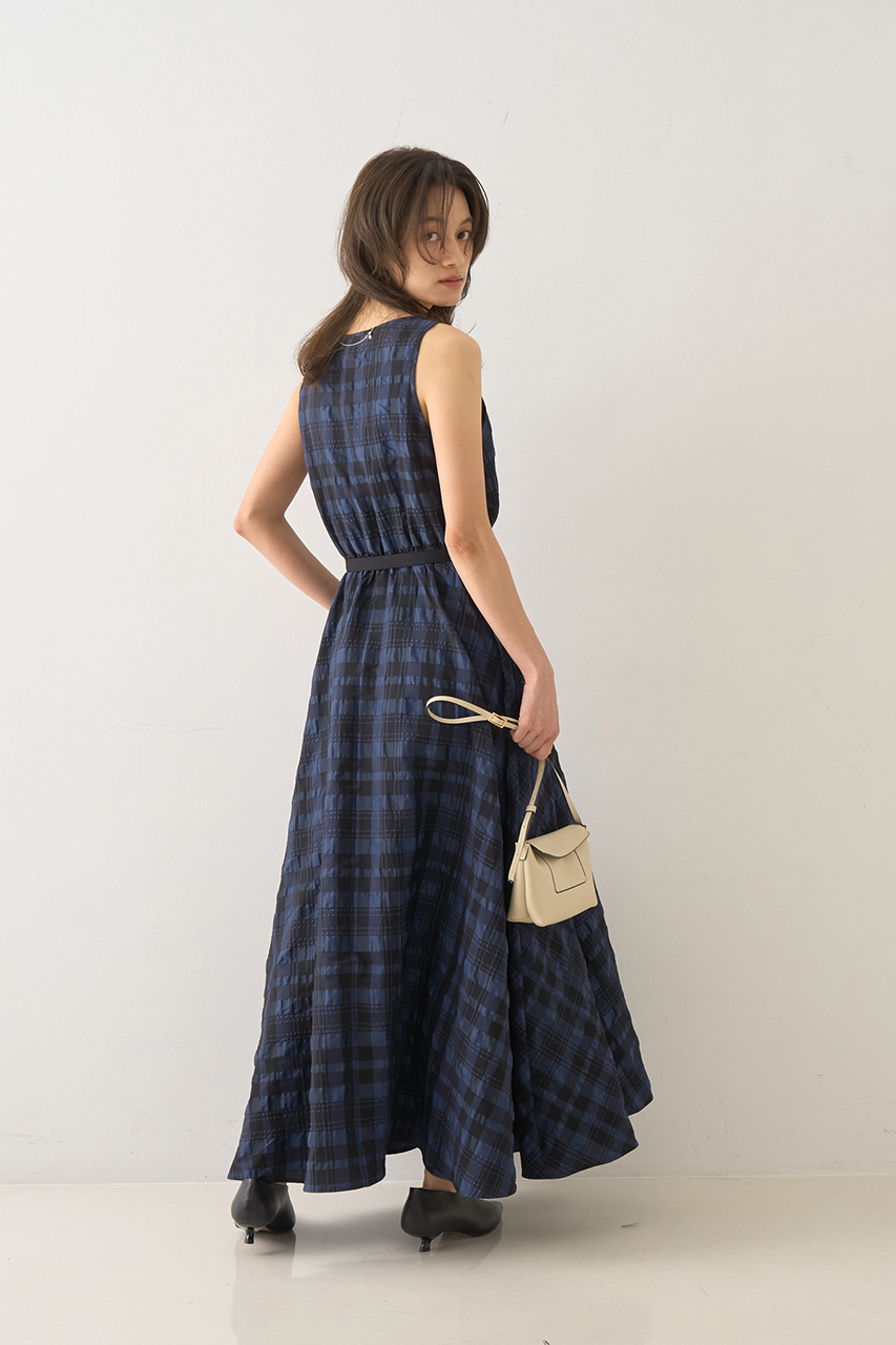 凹凸のある素材が肌に張りつかず、軽やかで涼しい着心地を実現。たっぷり広がるフレアスカートの美しいシルエットが、動くたびにドラマティックな印象を与えます。