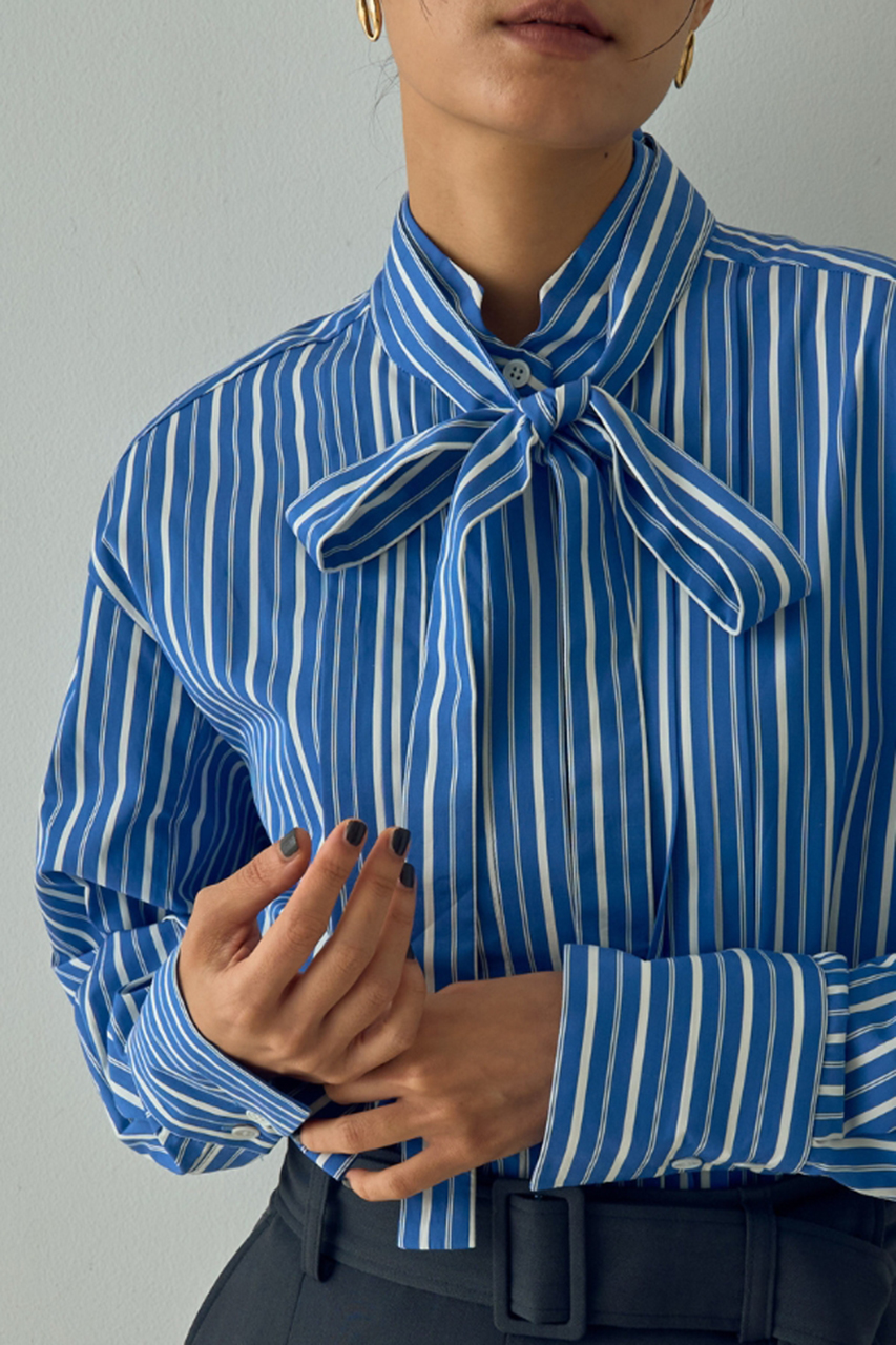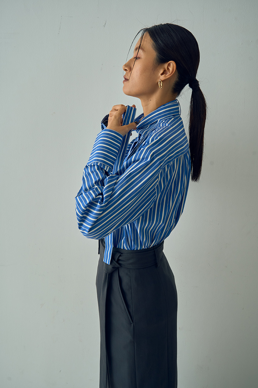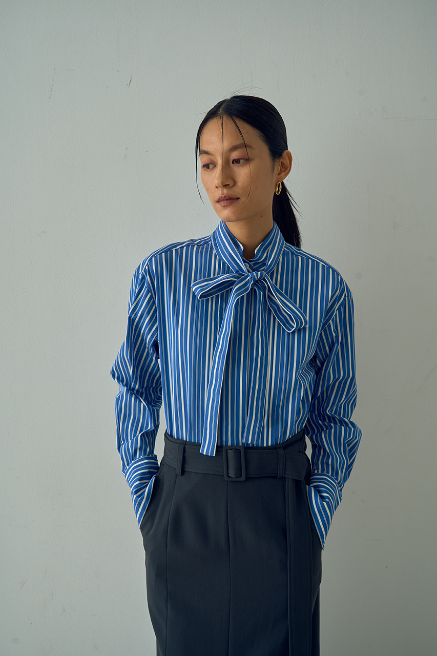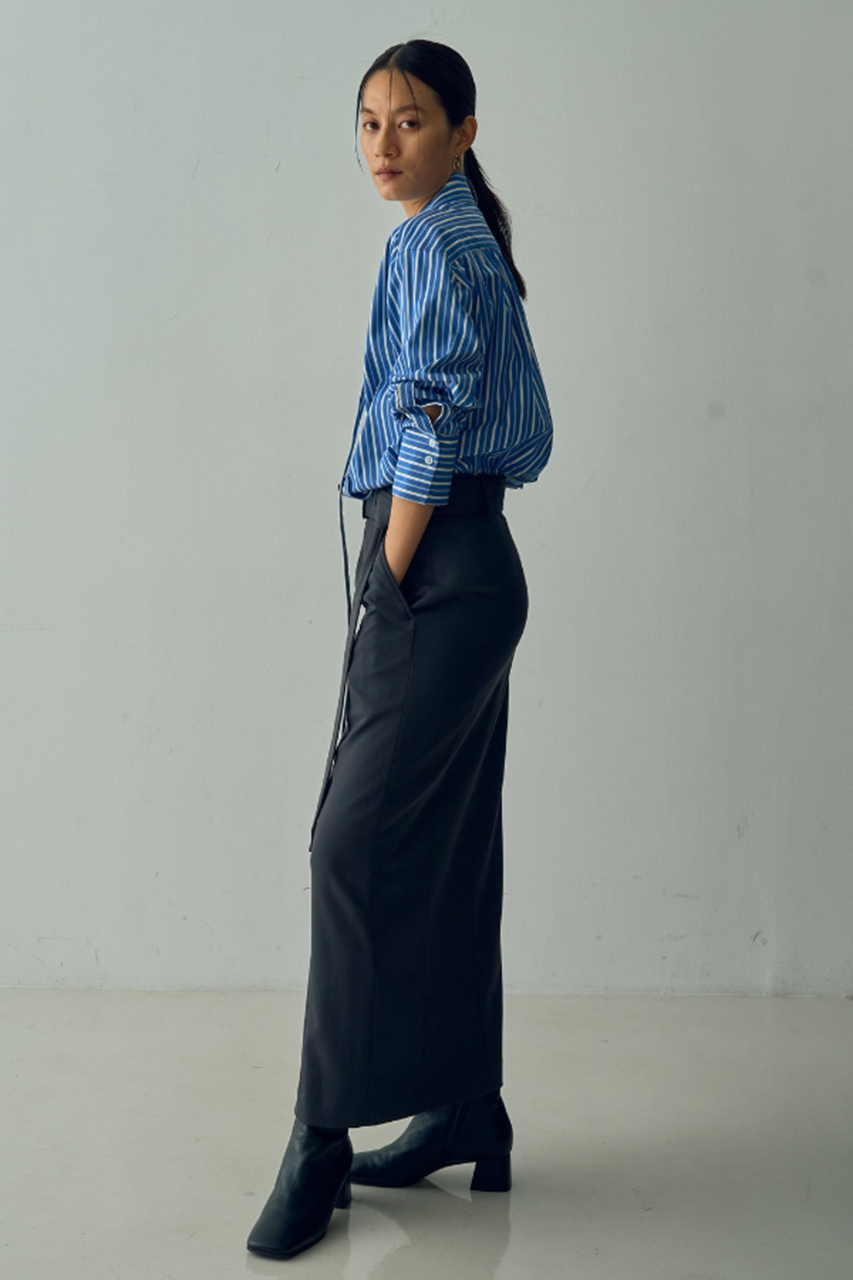 ほどよいハリと艶感のあるシャツ素材が、きちんと感を演出します。ボウリボンを同素材で添えることで、さりげなく統一感をプラス。セットで合わせたスカートは、縦のラインを引き立てるフロントスリット入りのペンシルシルエット。太めのベルトがウエストにアクセントを添え、知的でモードな雰囲気に仕上がります。オンの時間に自信を与える、秋のおすすめタイルです。