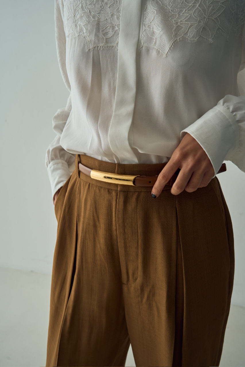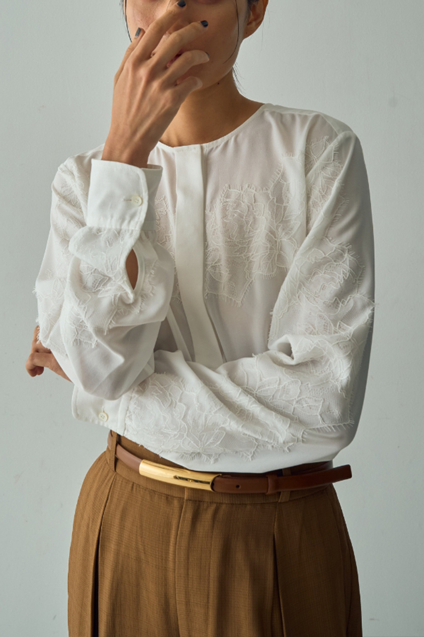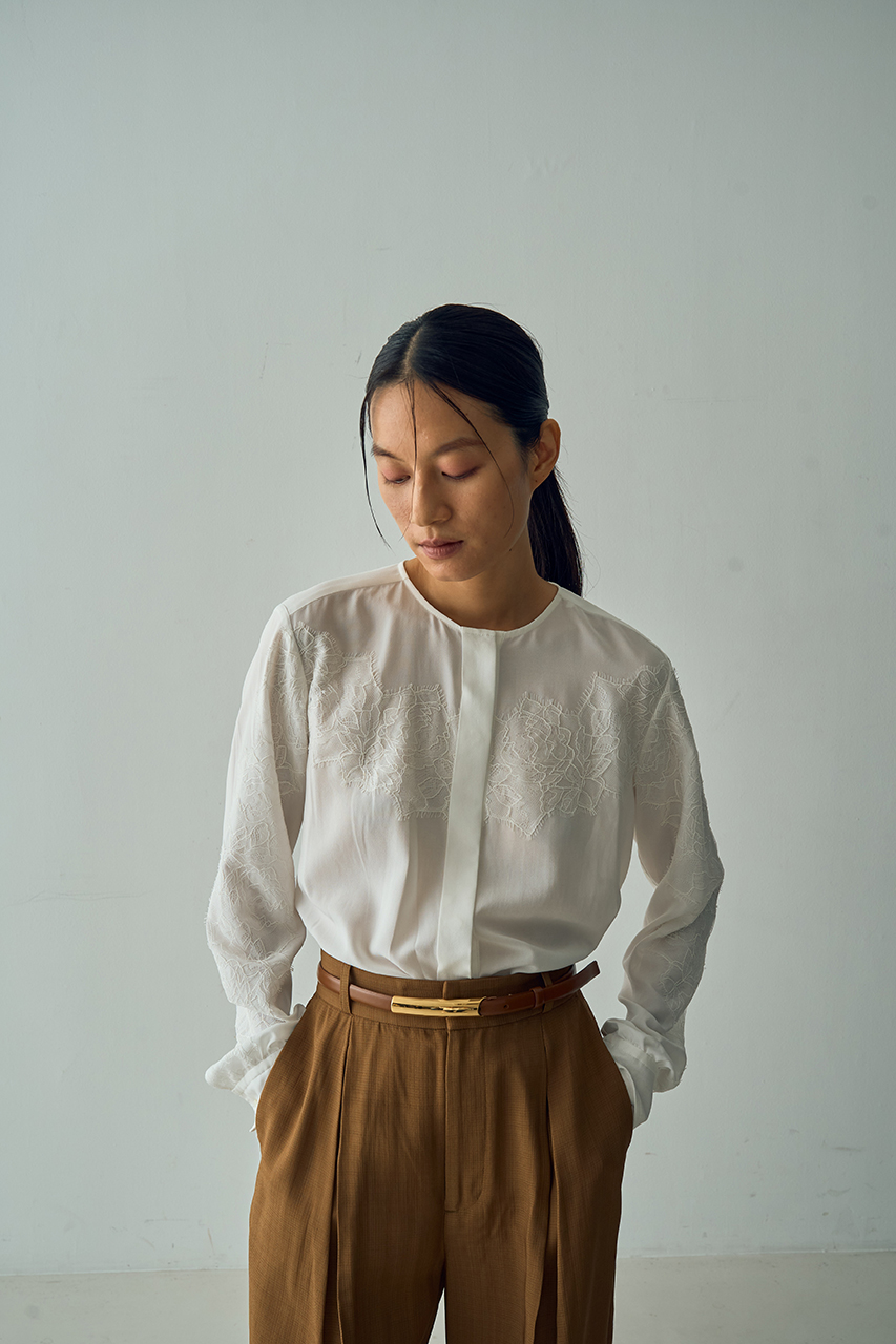 ラッセルレースをあしらったノーカラーブラウスは、比翼仕立てで仕上げた上品な佇まい。落ち感とキュプラの滑らかさが、肌に心地よく寄り添います。合わせたパンツは、ドライタッチな素材とテーパードラインが魅力の一本。軽やかな着心地と、マニッシュなシルエットが絶妙なバランスを生み出し、オンにもオフにも映える端正なスタイリングが完成します。
