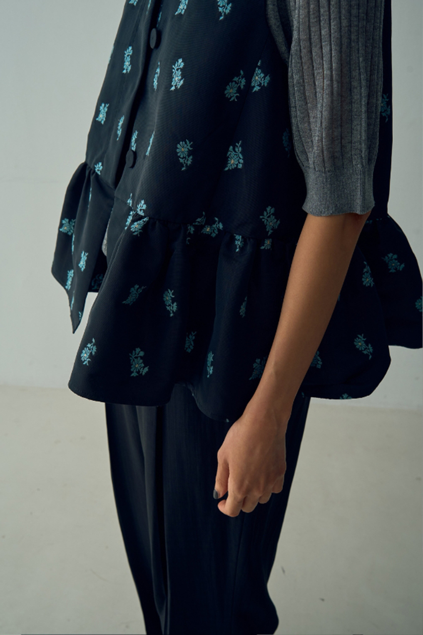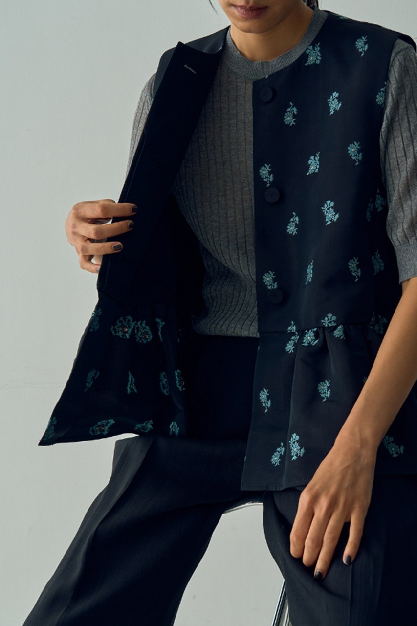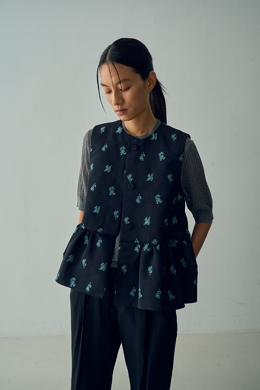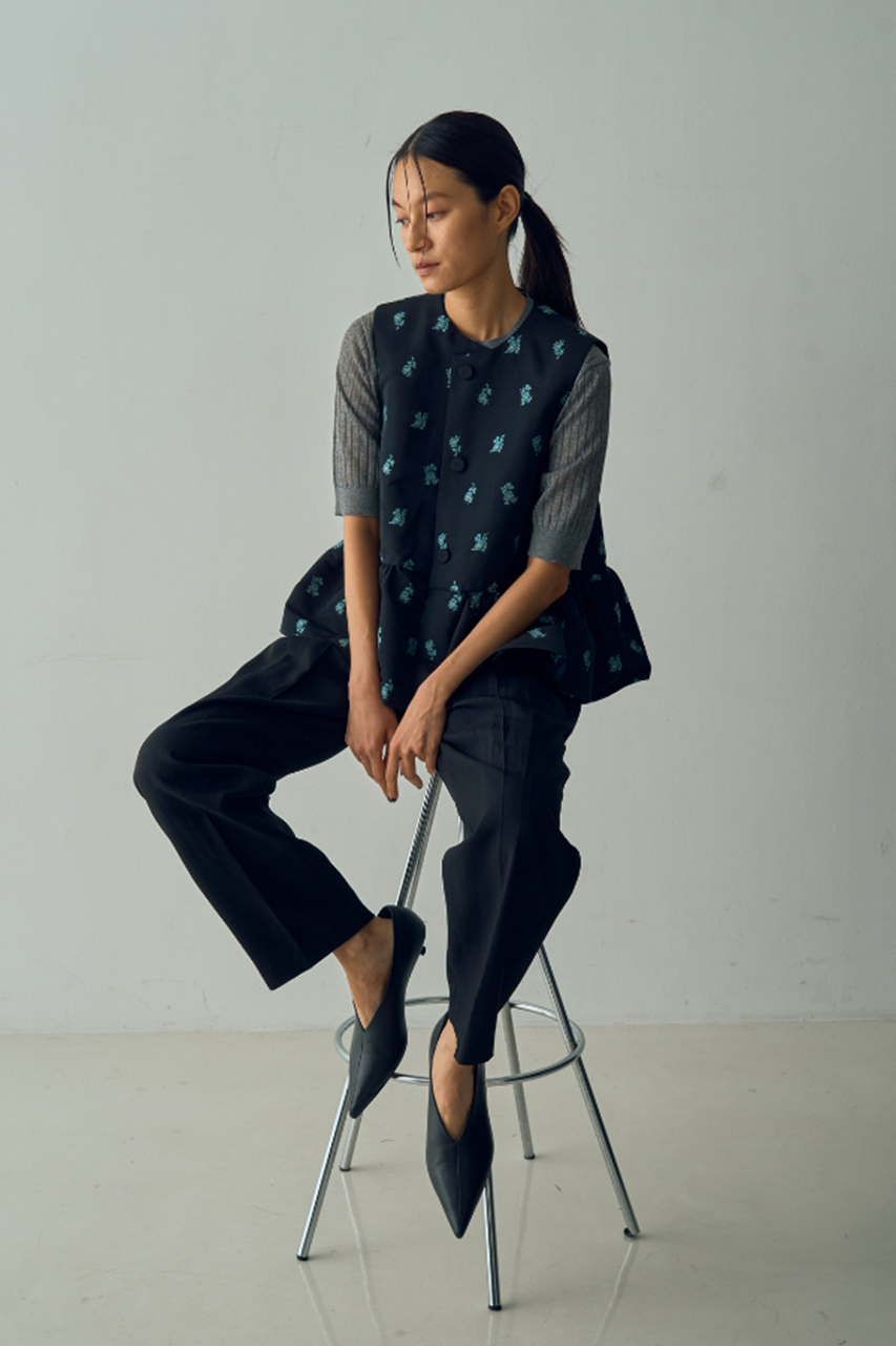 上品なツヤが奥行きを与えるジレは、ウエストを美しく引き立てるペプラムシルエットで、1枚で主役級の存在感を放つデザイン。合わせたパンツは、シャリ感のあるドライタッチ素材で、軽やかさと快適なはき心地を両立。華やかさと抜け感が絶妙に調和した、夏から秋へのスイッチスタイルにぴったりな組み合わせです。