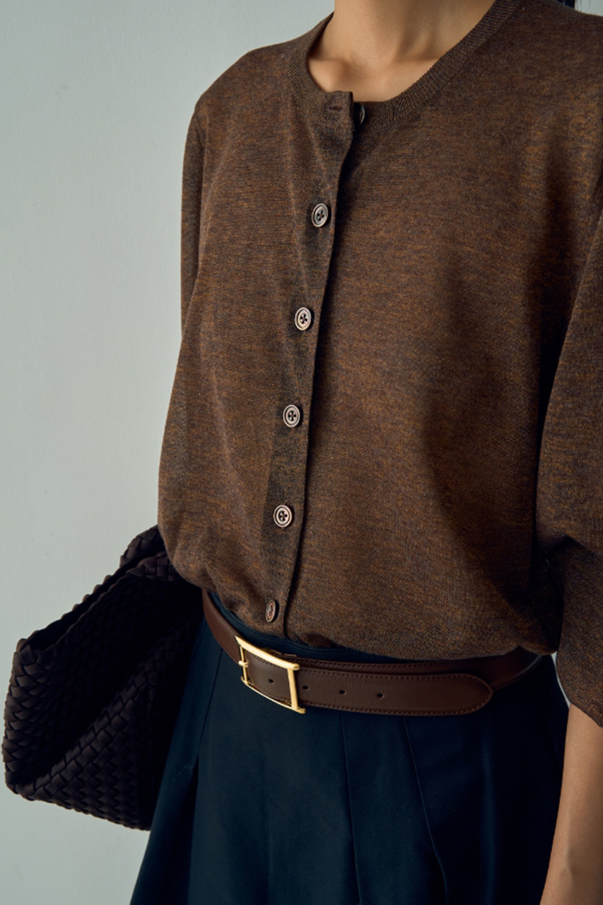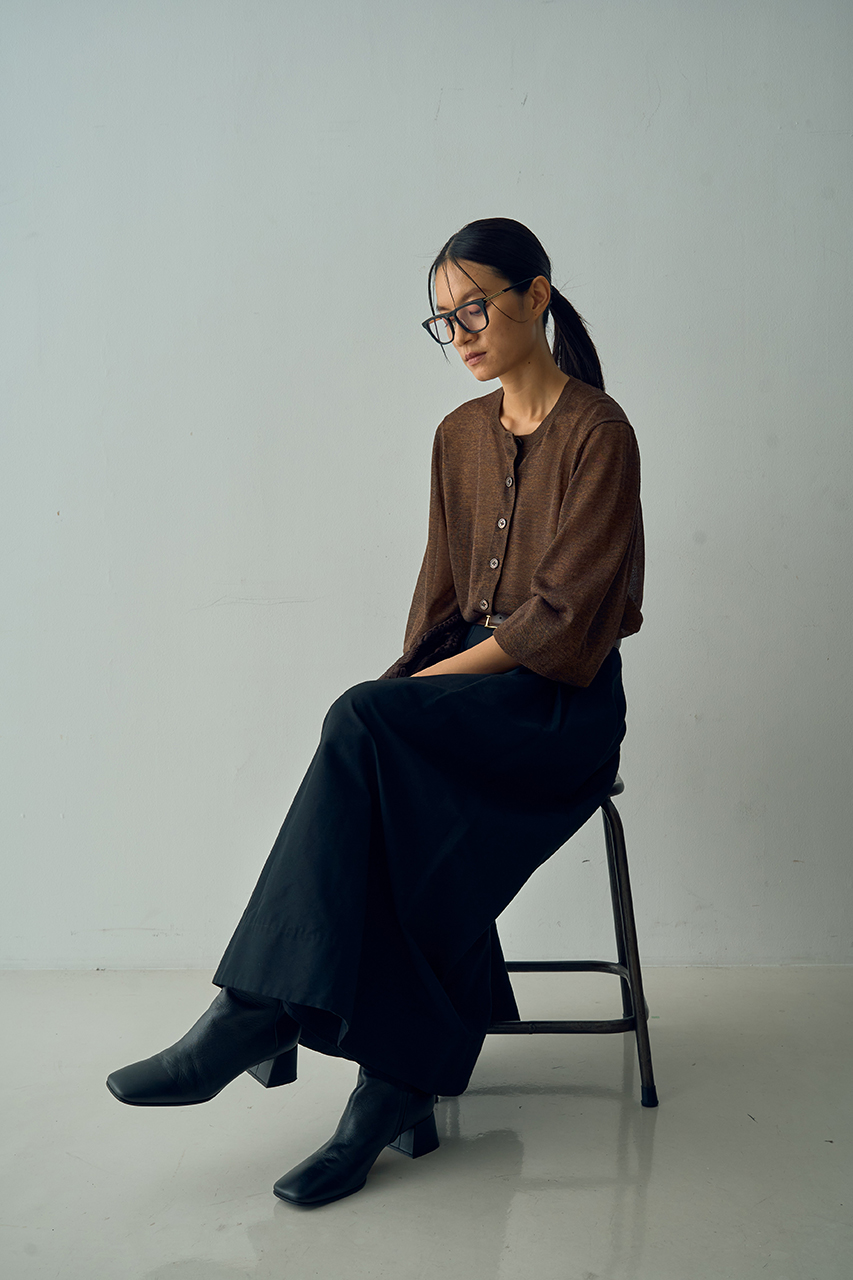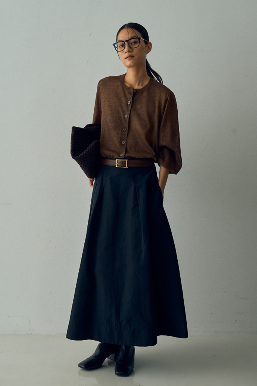 繊細なラメが輝くカーディガンは、コンパクトなフォルムと上質な風合いで、日常にそっと華やかさを添える一枚。合わせたAラインスカートは、前タックで立体感を出し、後ろはすっきりとしたデザインでバランス良く仕上げました。揺れ感のあるシルエットが動きに表情を与え、女性らしさと軽やかさを兼ね備えたスタイリングを叶えます。