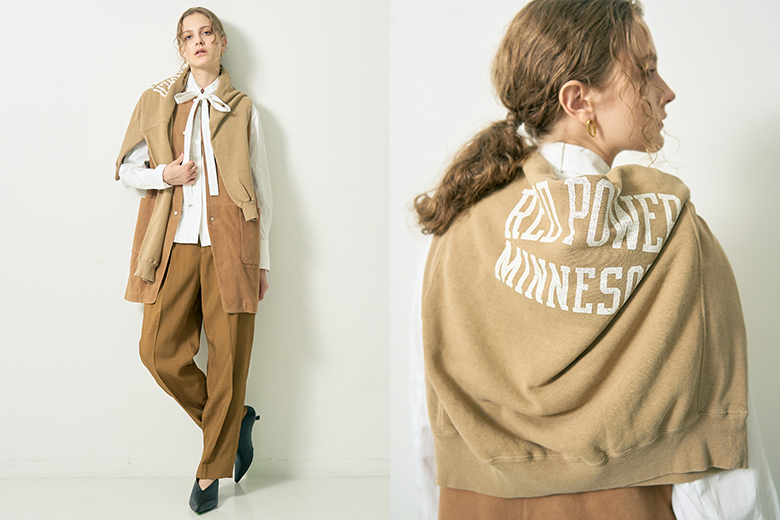 スウェットを肩掛けしたレイヤードスタイルに、ブラウンカラーのパンツを合わせたコーデ。トーンを揃えることで統一感を出し、異素材の組み合わせが奥行きと立体感をプラス。シンプルでありながらこなれた印象に仕上がる、大人のリラックススタイルです。